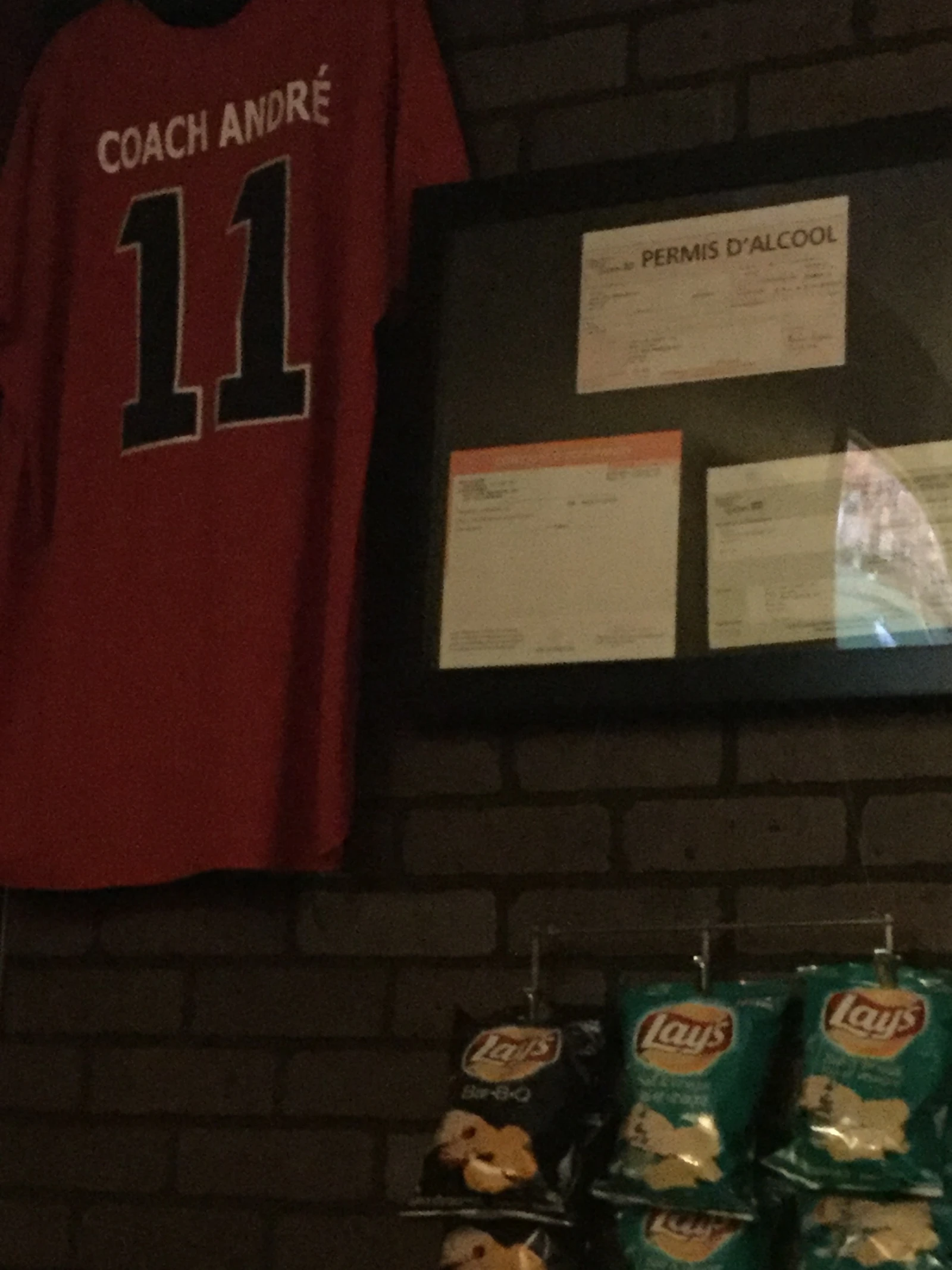 Venant à peine de nous attabler, nous remarquons cet agencement spectaculaire d’artefacts sur le mur de brique du bar. Soigneusement placé au centre de ses compères, le permis d’alcool nous apparaît comme un trophée que le propriétaire semble vouloir afficher de manière ostentatoire.