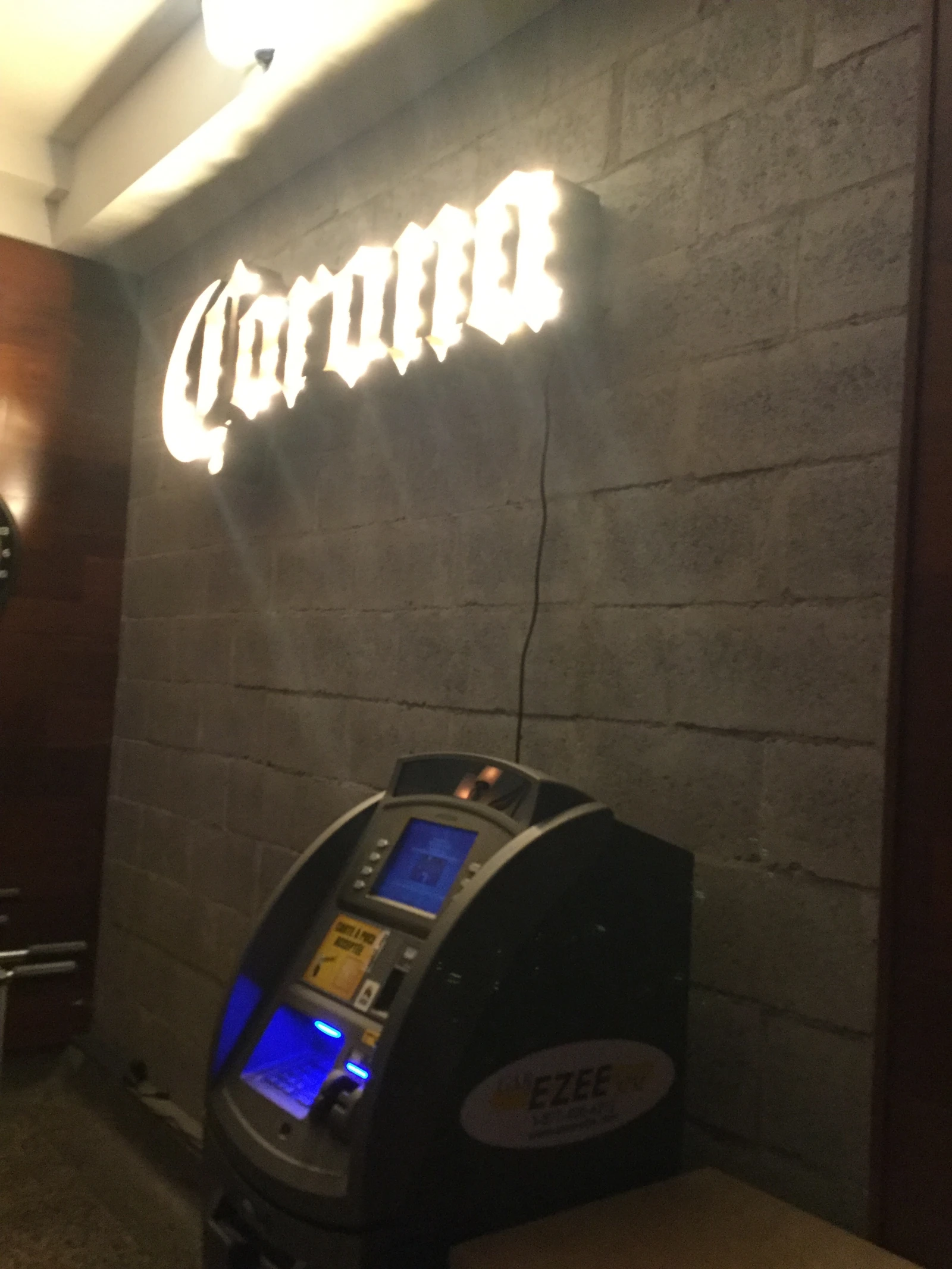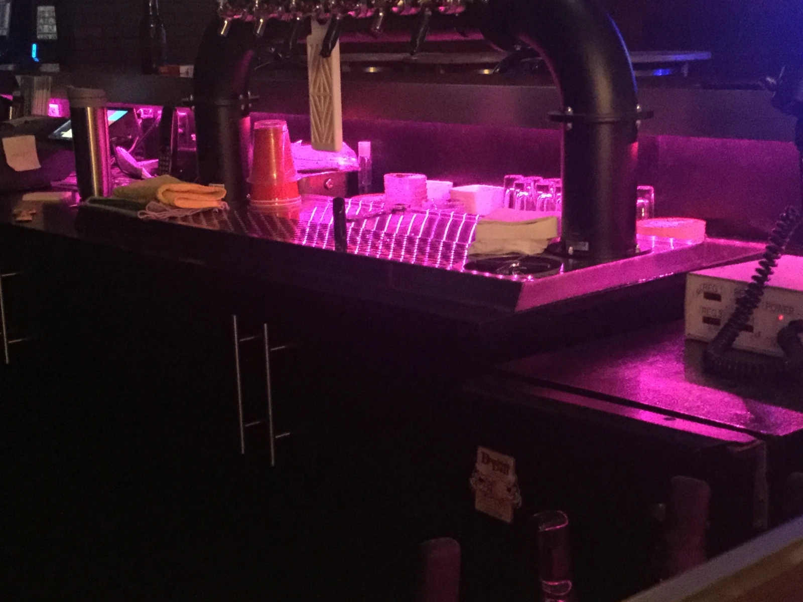 D’emblée séduits par le look bigarré de l’endroit, notamment constitué de briques, de bois et d’un gros tuyau en métal au plafond, nous sommes tout simplement conquis lorsque nous apercevons quelques caisses de bière en plein milieu du chemin menant aux machines à poker.