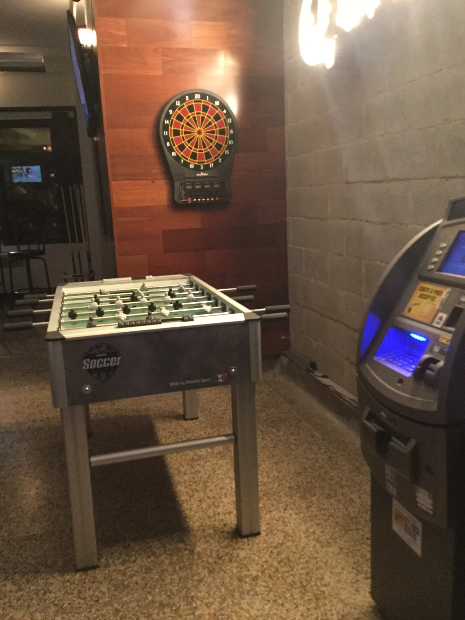 Alors que les téléviseurs diffusent une émission où des Japonais reçoivent un nombre incalculable de coups de pied dans la fourche, notre attention est détournée vers les nombreuses stations ludiques du bar.