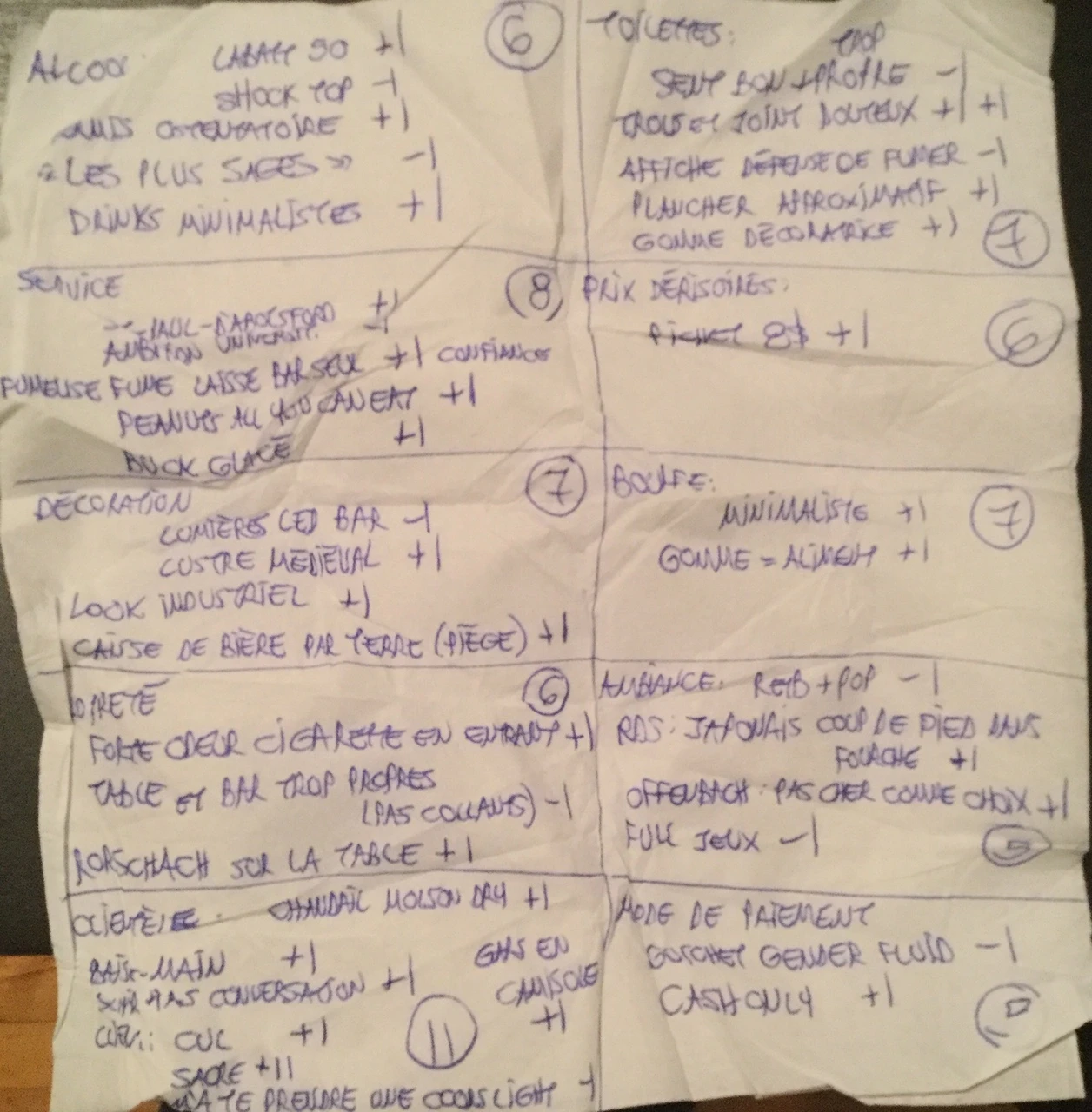 Proprement ivres, nous prenons soin d’écrire sur un napkin le résultat de nos différentes observations. Pour chacun des 10 critères, la taverne bénéficie d’emblée d’un total de cinq points, auxquels sont ajoutés ou retirés des points en fonction des motifs précédemment évoqués.