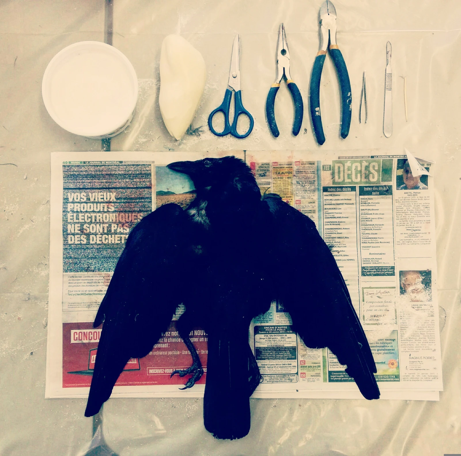 Devant moi, il y a de longues tables. Elles sont toutes recouvertes de plastique et à chaque place, il y a : du papier journal, du borax, un gugusse blanc en styromousse et une énorme corneille fraîchement dégelée. Je sors mes outils : scalpel, ciseau, pince long nose, pince cutter, pince à épiler et gants de latex.