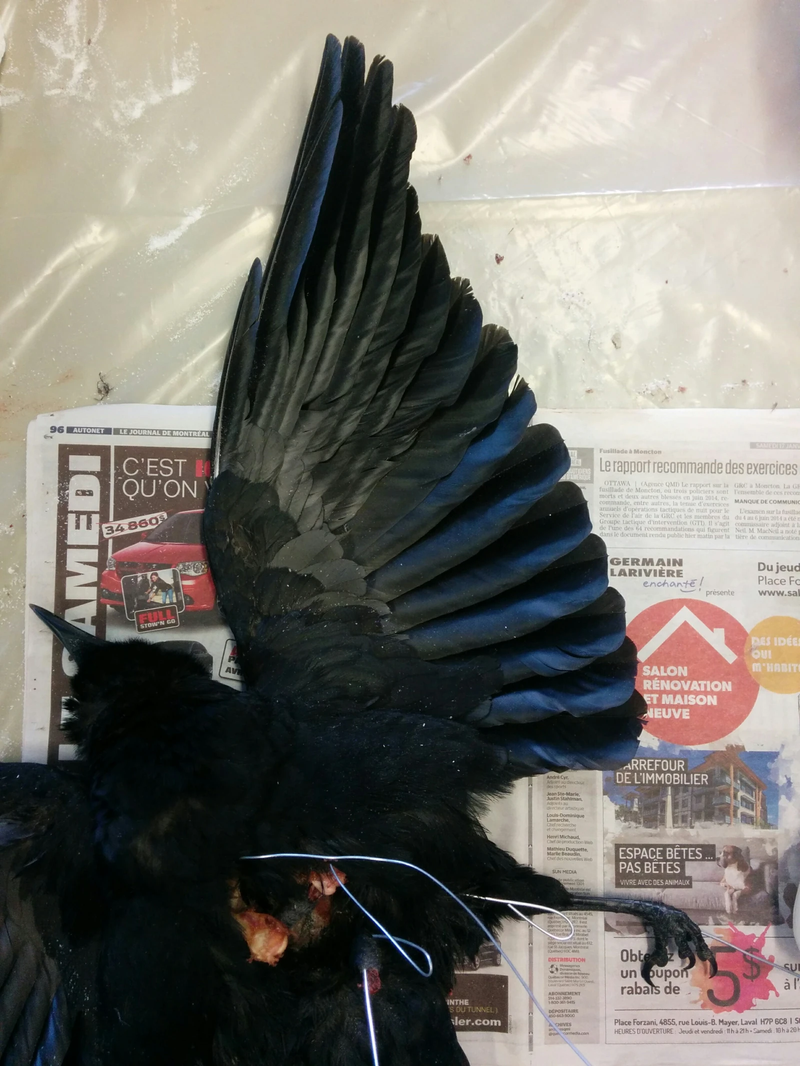 17 h : FUCK! J’ai réussi, j’ai une corneille empaillée qui tient sur une p’tite plaque de plywood… mais je dois admettre que quelque chose cloche.