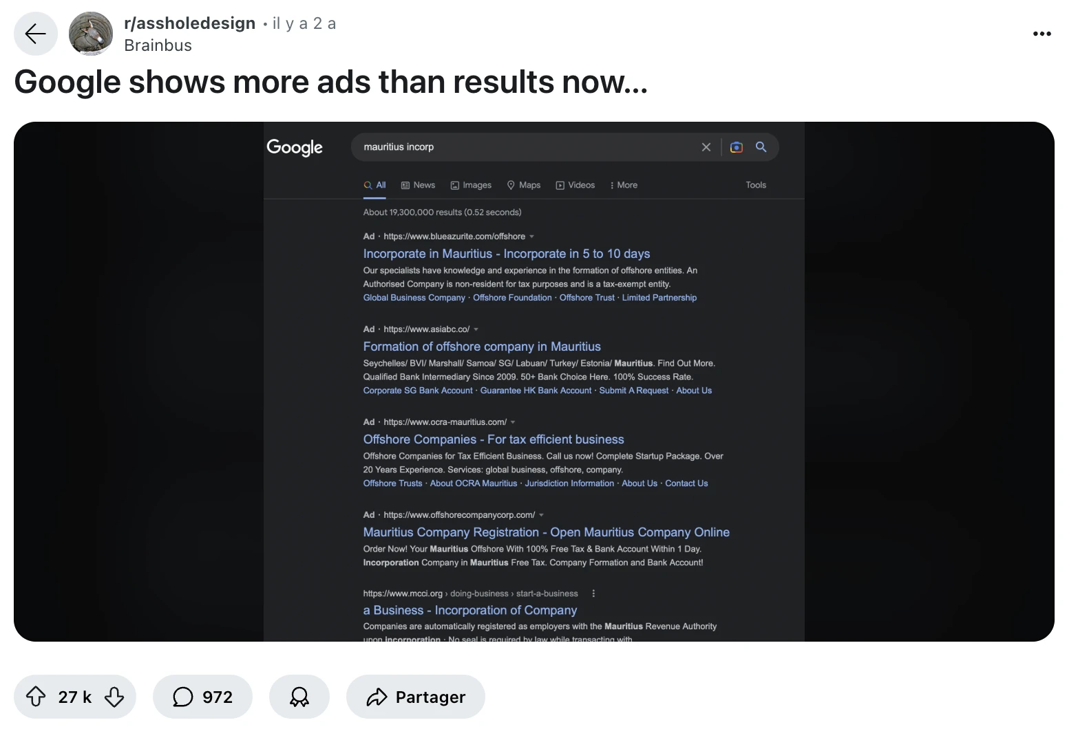 Google rendant ces liens commandités de moins en moins facilement reconnaissables sur sa page, cliquer accidentellement dessus est aussi facile que d’imaginer la frustration ressentie face à cette trahison, justifiant la décision de placer « Reddit » à chaque fin de requête pour s’assurer de ne plus tomber dans le panneau.