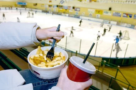 Ça sent le sport quand tu prends finalement place à l’aréna avec une poutine brûlante dans un plat en styromousse. Inévitablement, la sauce déborde à l’extérieur du contenant et tes mains sentiront la sauce brune surchauffée pendant quelques heures. Le trop-plein de fromage en crotte sera mangé sans l’aide de la fourchette, jusqu’à ce que tu atteignes les premières frites en dessous de ce tapis morcelé de fromage bon marché.