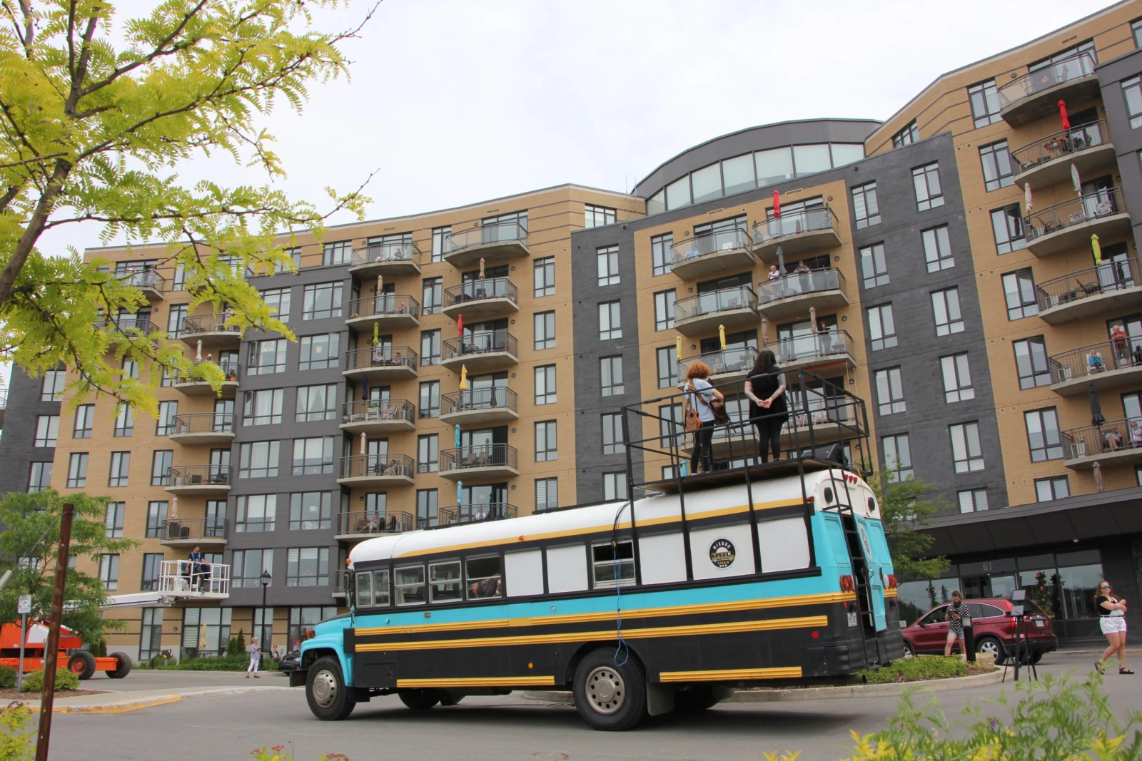 Parallèlement à tout ça, Mixbus s’est construit une nouvelle clientèle assez inusitée : les personnes âgées. « On était inspirés par les Italiens qui jouaient du violon sur leur balcon. On voyait ça sur les réseaux sociaux, et nous, on a un balcon roulant! J’ai contacté la résidence de ma grand-mère, et on a organisé des spectacles pour 35 résidences de leur groupe », raconte Isabelle. « On est restés dans nos valeurs de créer des rassemblements, de partager la musique, de distribuer la magie, mais ça nous a forcés à trouver d’autres moyens de connecter avec les gens », résume-t-elle. L’hiver est toujours plus tranquille pour Jacob et Isabelle, mais une chose est sûre : pandémie ou pas, leur flotte promet de continuer à rouler l’été prochain – et de monter le son au passage.