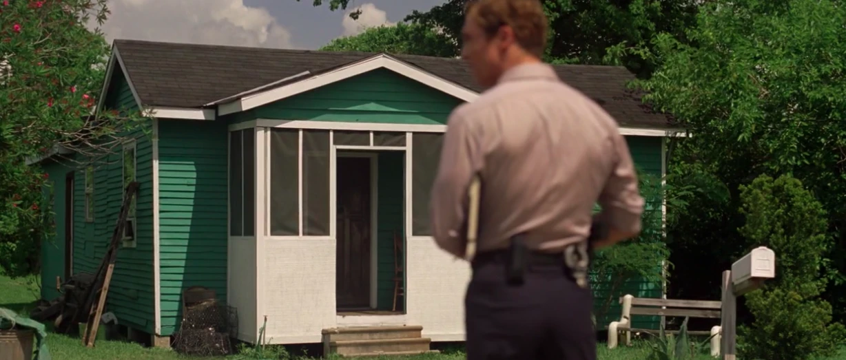 …vous remarquerez peut-être que dans ce court plan (qui dure à peine 3 secondes), Rust cogne à la porte de la maison d’un témoin important qu’il n’aura finalement la chance de questionner que 17 ans plus tard. Il y prend LA photo qui lui permettra ultimement de résoudre l’affaire. À la première écoute, on cherche le tueur dans chaque plan comme Rust, mais à la troisième, quatrième, cinquième, on commence à mieux apprécier à quel point il est excellent dans sa job.