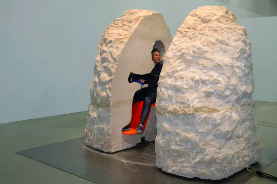 Abraham Poincheval s’est également offert un huis clos à rendre fou toute personne claustrophobe en prenant place durant huit jours dans une cavité ajustée à sa silhouette creusée à l’intérieur d’un bloc de pierre de douze tonnes. « J’aimais l’idée d’une discussion avec un objet inanimé », souligne Abraham, qui a eu l’idée de ce sujet au cours d’une balade en montagne.