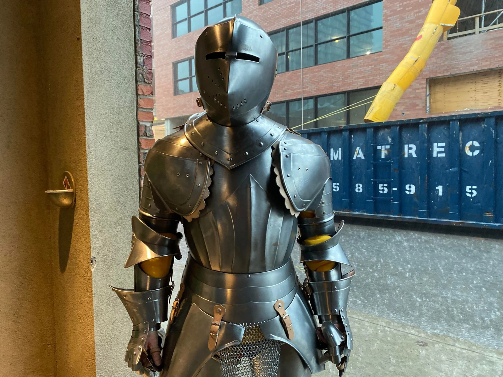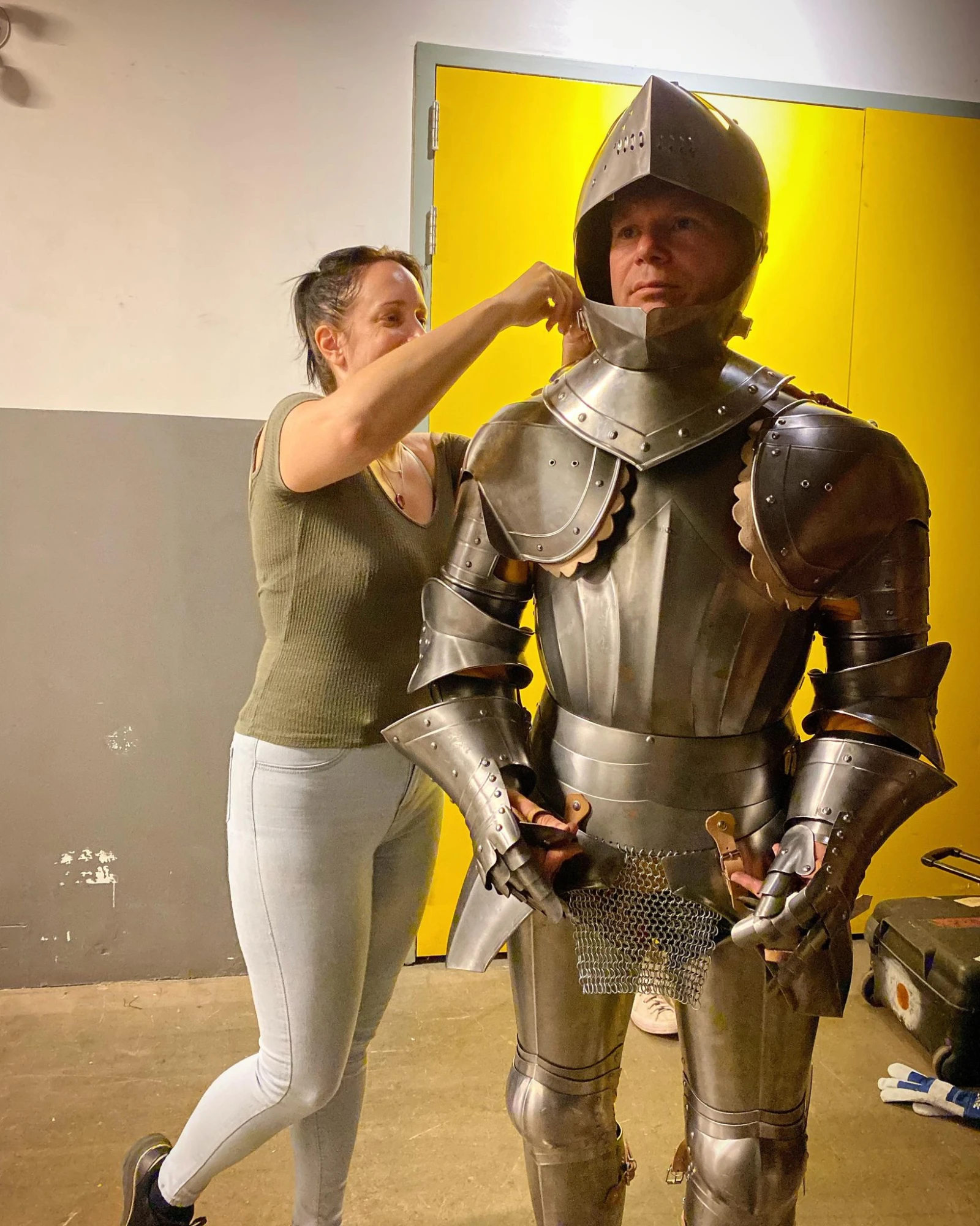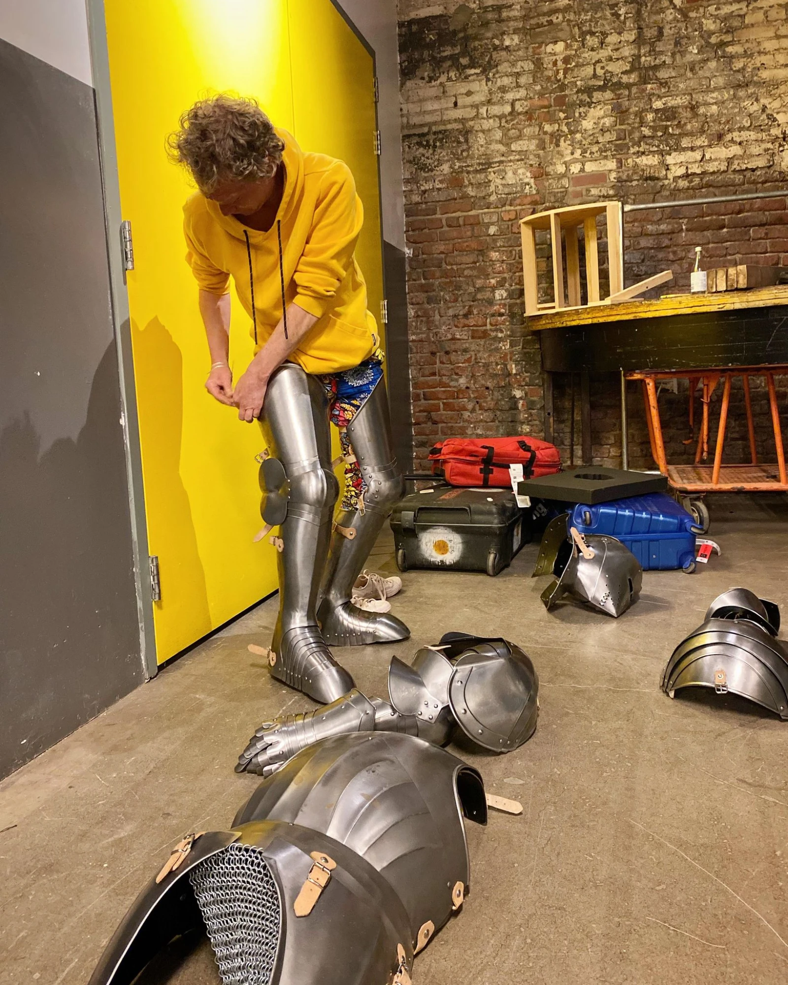 Avant de partir, l’artiste accepte d’enfiler son armure pour les besoins d’une photo. Il extirpe les morceaux pesants de deux valises, avant de les revêtir un à un avec l’aide de Geneviève. Une sorte de répétition de ce qui les attend pour les neuf prochains jours.