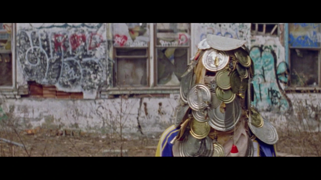 Charles : J’ai évidemment écouté la chanson plusieurs fois. J’ai lu des trucs sur le projet, regardé des photos. Mais j’avais aussi certaines idées que je voulais tester depuis longtemps. Une lentille que je voulais essayer et qui était parfaite pour ce projet, mais aussi à propos du masque. Il y a un film que j’adore de Ben Rivers [NDLR https://vimeo.com/143020621] dans lequel un gars porte un costume en boîte de conserve et il se fait tirer dessus partout au Maroc… En tout cas, c’est un film un peu obscur! Ce masque-là, ça faisait un bout que je l’avais en tête et je trouvais que ça fittait avec cette idée d’anonymat et que ça fonctionnait bien avec le médium du 16mm. On parlait aussi d’une surface qui réfléchit la lumière, le masque métallique était parfait pour ça. Ça allait bien fonctionner aussi avec le côté granuleux de l’image. Avec une image ultra nette HD, on aurait vu toutes les coutures du masque, j’ai l’impression que ça aurait sonné faux.