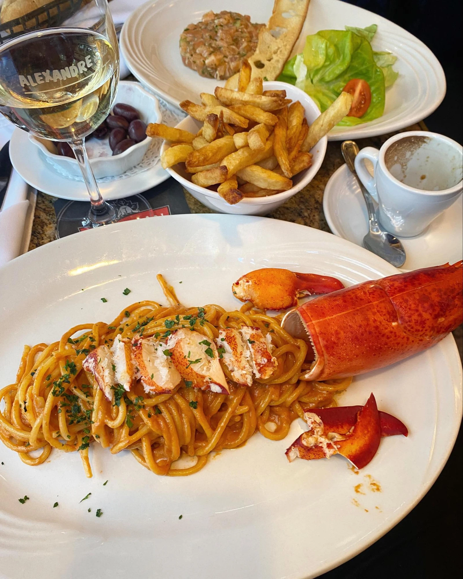 La bouffe arrive. Des pâtes au homard (40$) pour moi, le tartare de saumon pour Denis (39$). Pour accompagner le tout, Denis commande un verre de blanc (15,50$), le mien n’est pas encore fini. Je suis un professionnel, après tout.