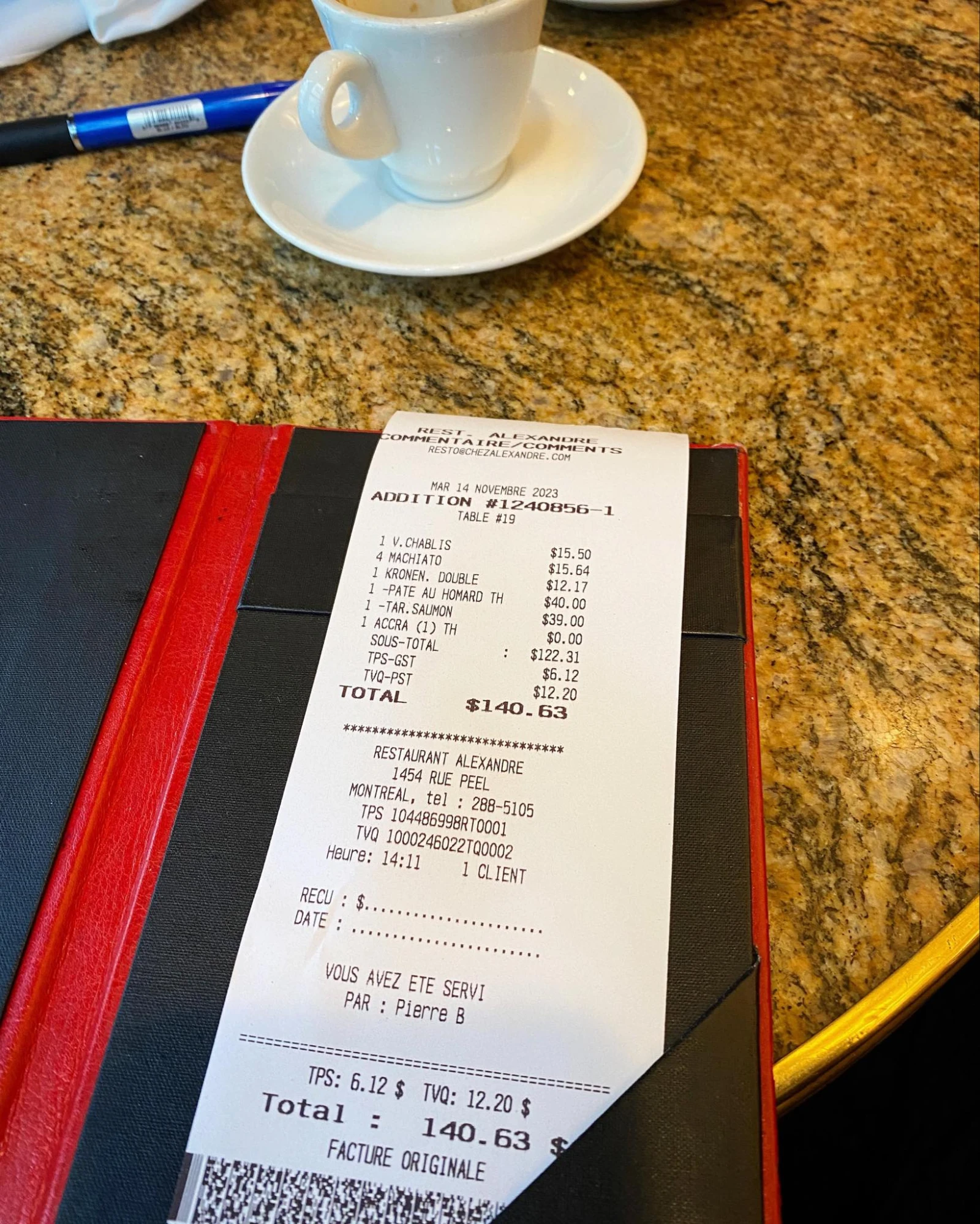La serveuse apporte la facture. 140,63$. De la petite bière (ou pas assez de champagne), comparé aux dépenses de l’OCPM.