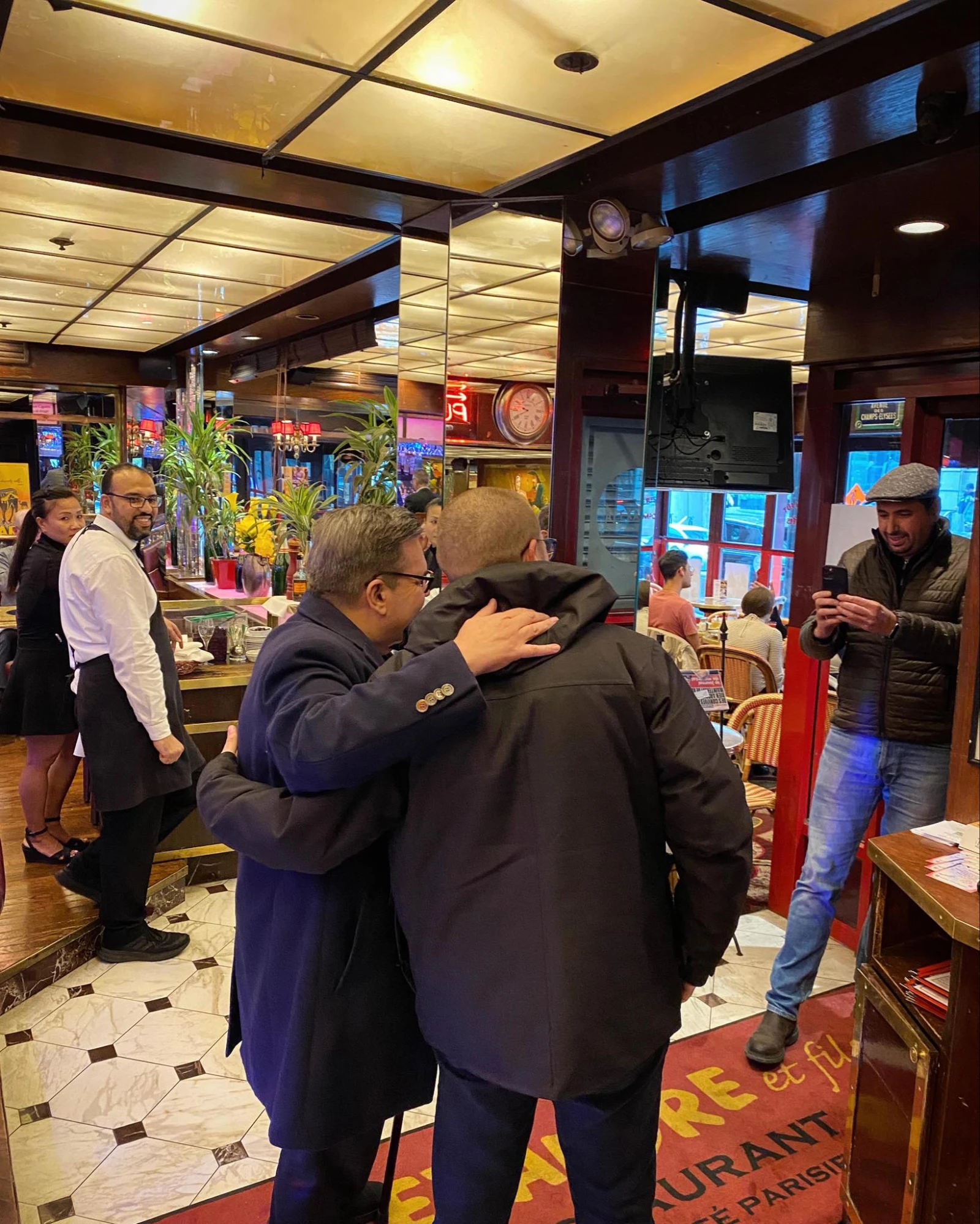 Je quitte Denis Coderre, en train de se faire demander un selfie avec deux clients. « J’aime le monde », me disait-il, un peu plus tôt, après mon entrée d’acras de morue (incluse dans la table d’hôte).