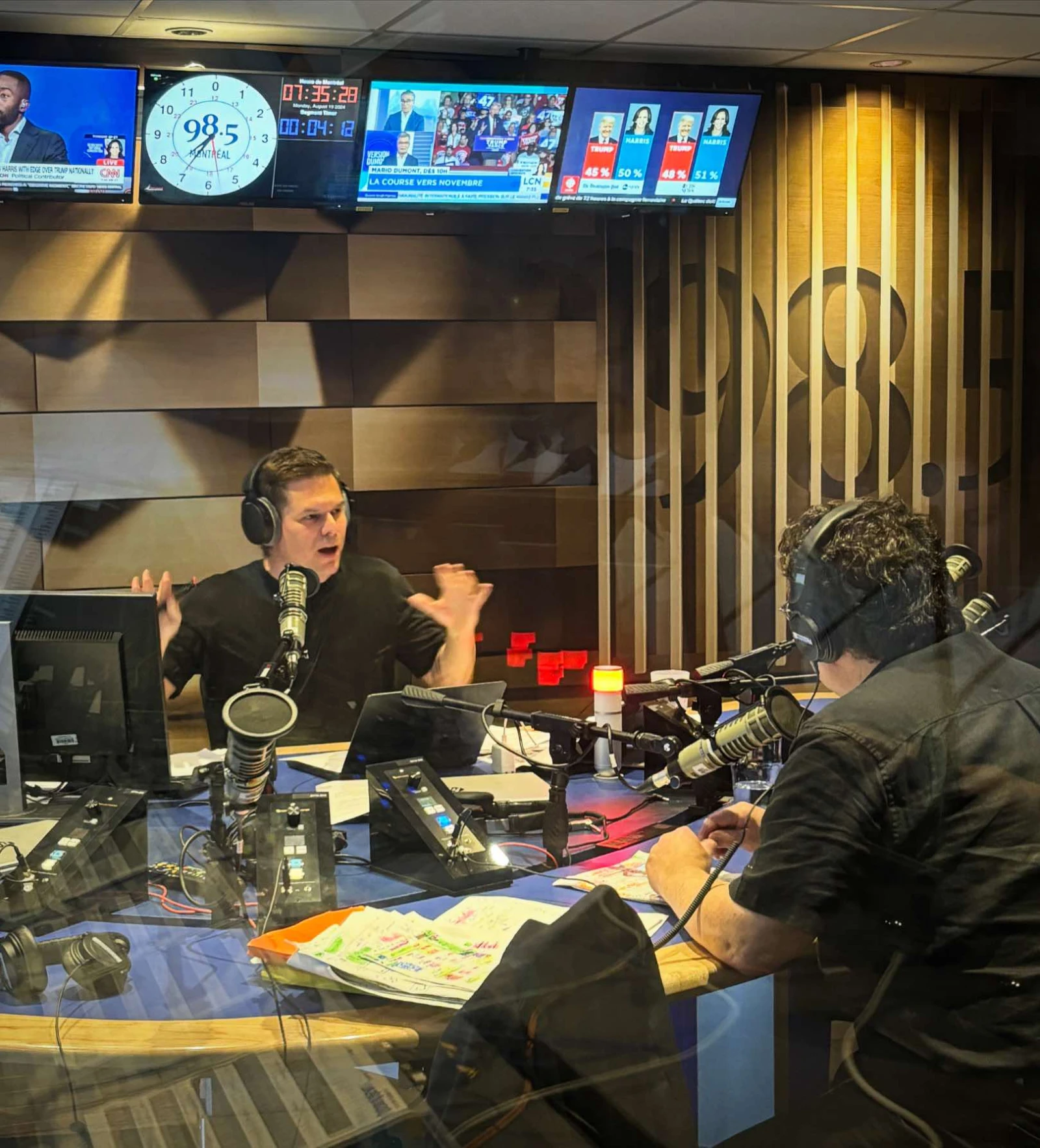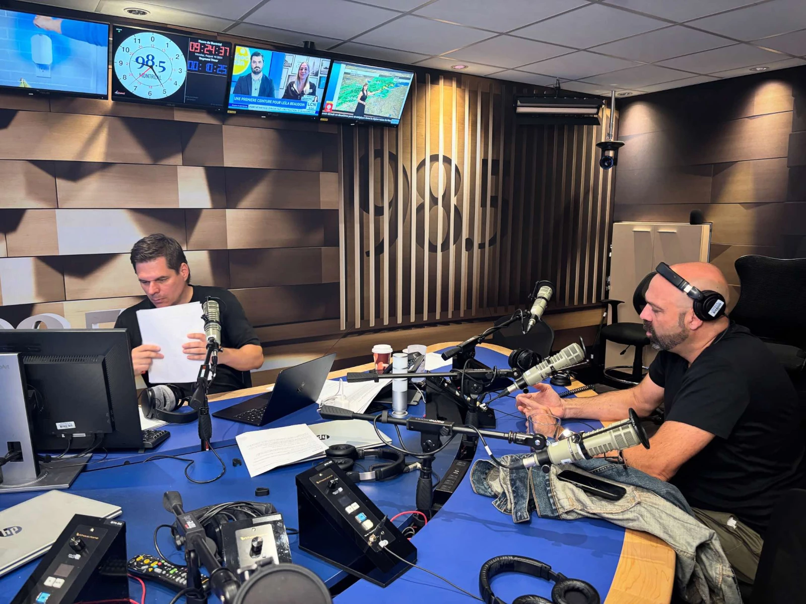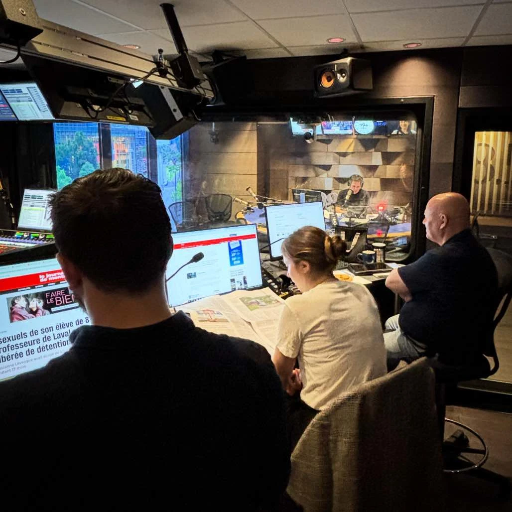 En régie, les recherchistes s’activent. Durant les pauses, le producteur Fred vient updater l’animateur. Un premier invité, le ministre de l’Éducation, Bernard Drainville, est attendu d’une minute à l’autre.