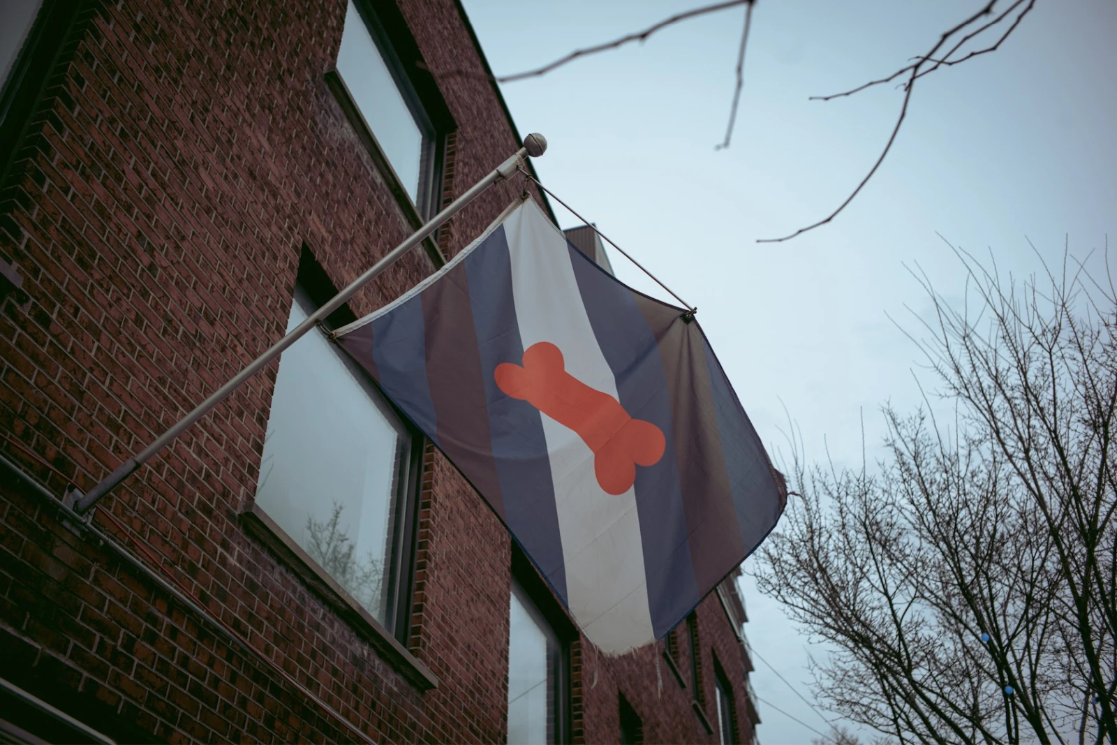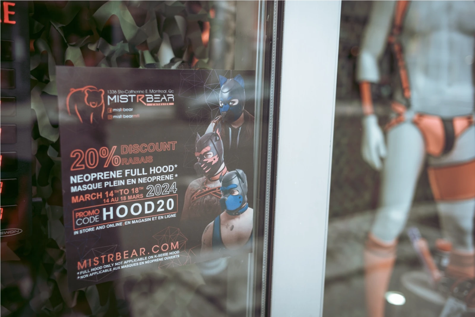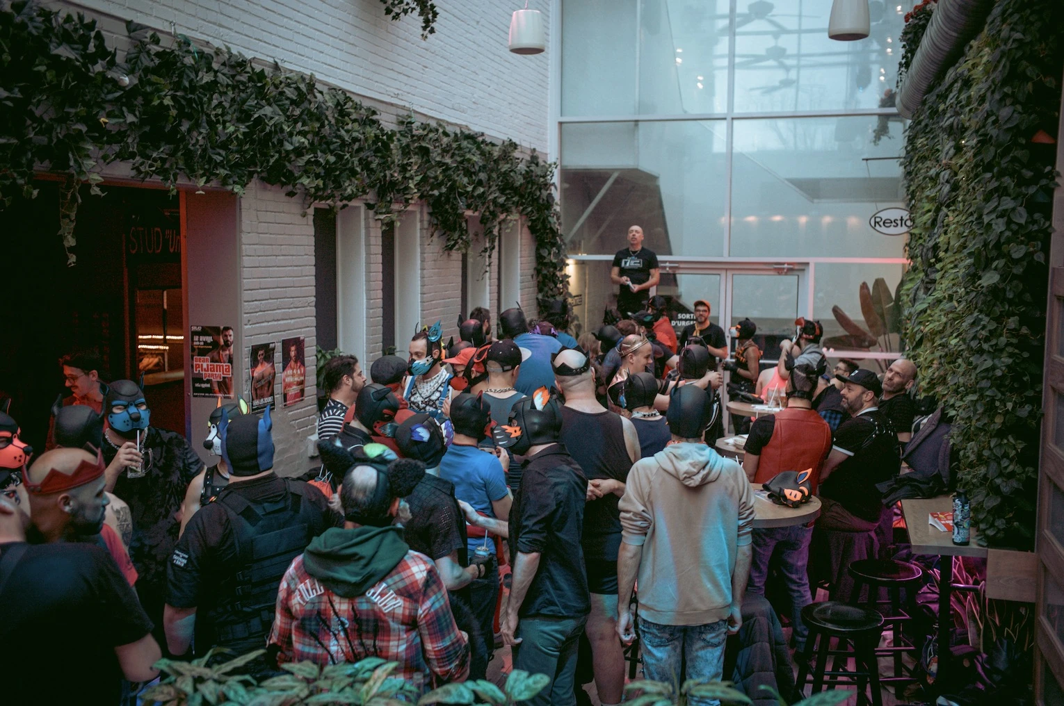 Mon périple continue vers le bar Le Stud, après un arrêt obligé devant la vitrine de la boutique MistR Bear où, justement, des masques canins sont en vente. Quelques mètres plus loin, je retrouve leur drapeau orné d’un os, symbole de la sous-culture, dominant la rue Papineau.