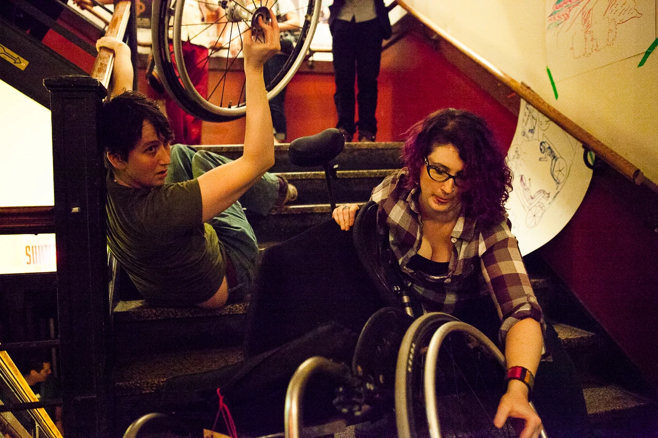 Le meilleur exemple est celui de Encuentro, collectif d’artistes qui offrait en 2014 des “techniques esthétiques, sociales et chorégraphiques qui, par des actions, des paroles incarnées et des manières d’être transforment les idées politiques en images collectives” – bref, un groupe d’artistes, qui par sa définition et sa mission, devrait naturellement favoriser les lieux de diffusion accessible…