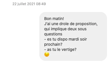 Le concept de ma prochaine date en poche, ne me manque que de la compagnie. J’y pense un instant: je vais me retrouver dans une nacelle à 60 mètres du sol pendant plusieurs minutes, je ne peux quand même pas y aller avec n’importe qui. Comme je ne souhaite pas me retrouver dans une situation embarrassante ni dans un scénario digne d’un film d’horreur, je sélectionne un candidat que je connais déjà un peu et slide tout de go dans ses DM.