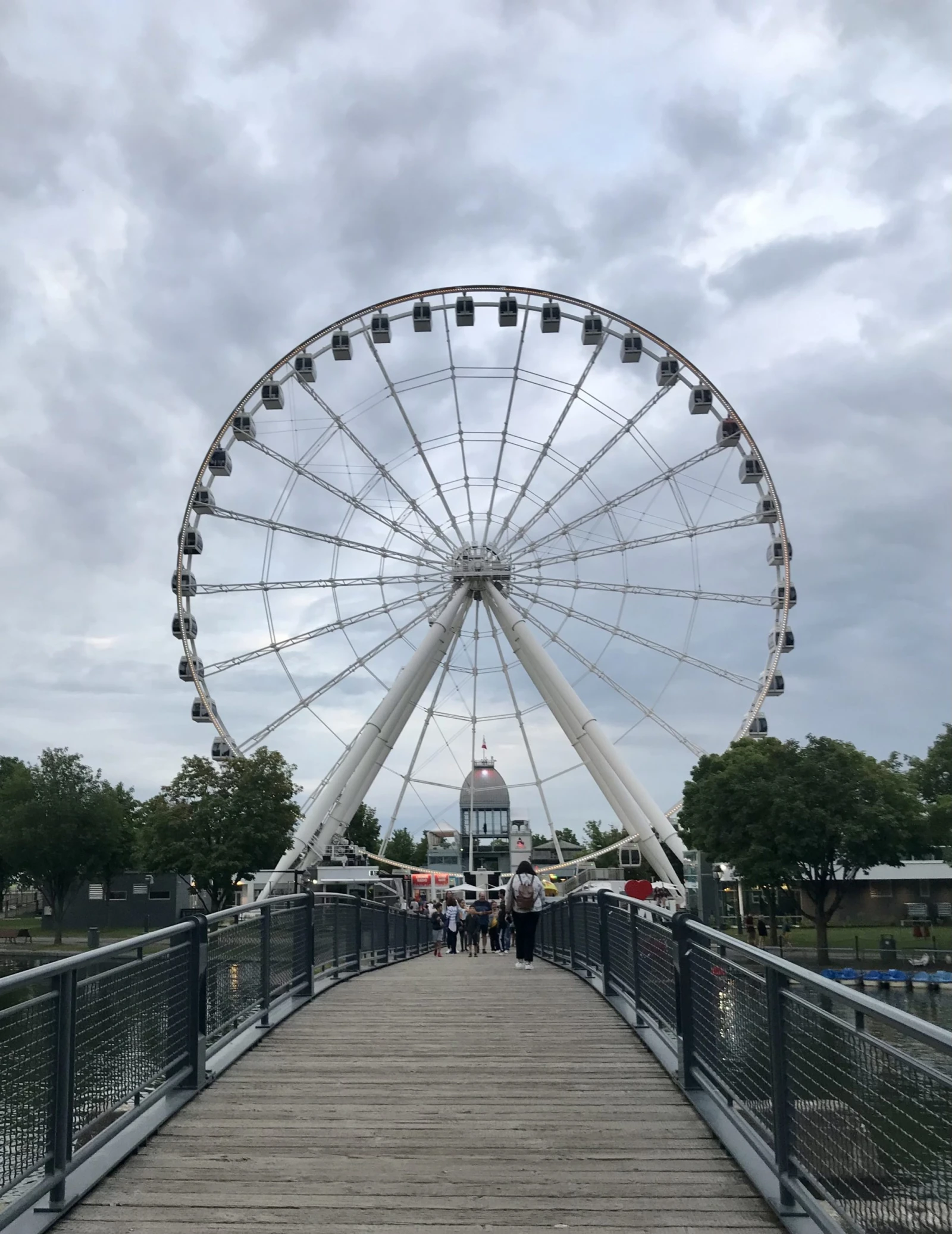J’arrive au Vieux-Port. Malgré la soirée fraîche et la menace de pluie, j’ai mis une robe à fleurs. Tant qu’à faire. Trois quatre groupes de touristes me demandent de les photographier devant l’énorme signe J’❤️ MONTRÉAL, puis ma date arrive, tout sourire. On regarde le ciel bas à travers lequel percent les derniers rayons de soleil. « On dirait un ciel de peinture de la Renaissance! » affirme candidement mon invité de choix, semant tout de suite un peu de poésie sur les berges du Vieux-Port. C’est donc sur une note Michelangelesque que débute notre rendez-vous roue.
