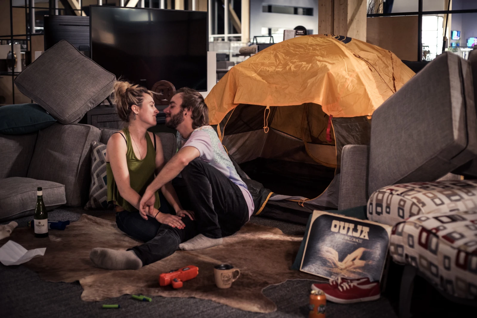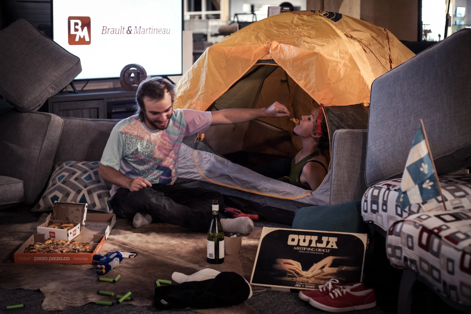 Le plaisir de l’interdit, j’pense que c’est un trip qui vient de notre « enfant intérieur ». Alors quand on m’a proposé de passer la nuit dans un Brault & Martineau, j’ai tout de suite su à qui j’allais proposer de m’accompagner : à cette date qui me fait toujours sentir comme une adolescente. « Yo, ça se peut que tu me trouves vraiment weird… mais aimerais-tu passer une nuit avec moi dans un magasin fermé? Genre on pourrait se faire une grosse cabane de coussins. » Sans hésitation, et sans grande surprise, il m’a répondue : « Fuck oui! ».