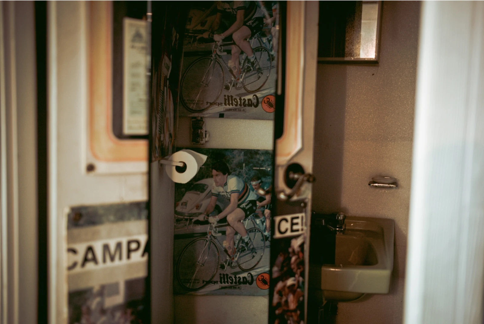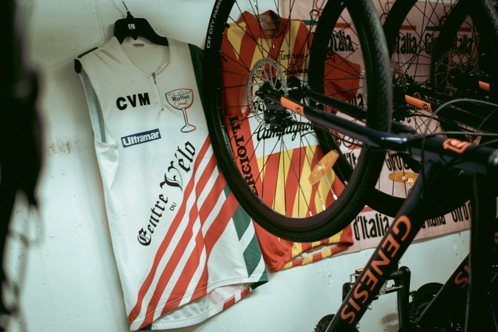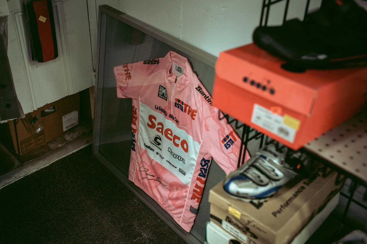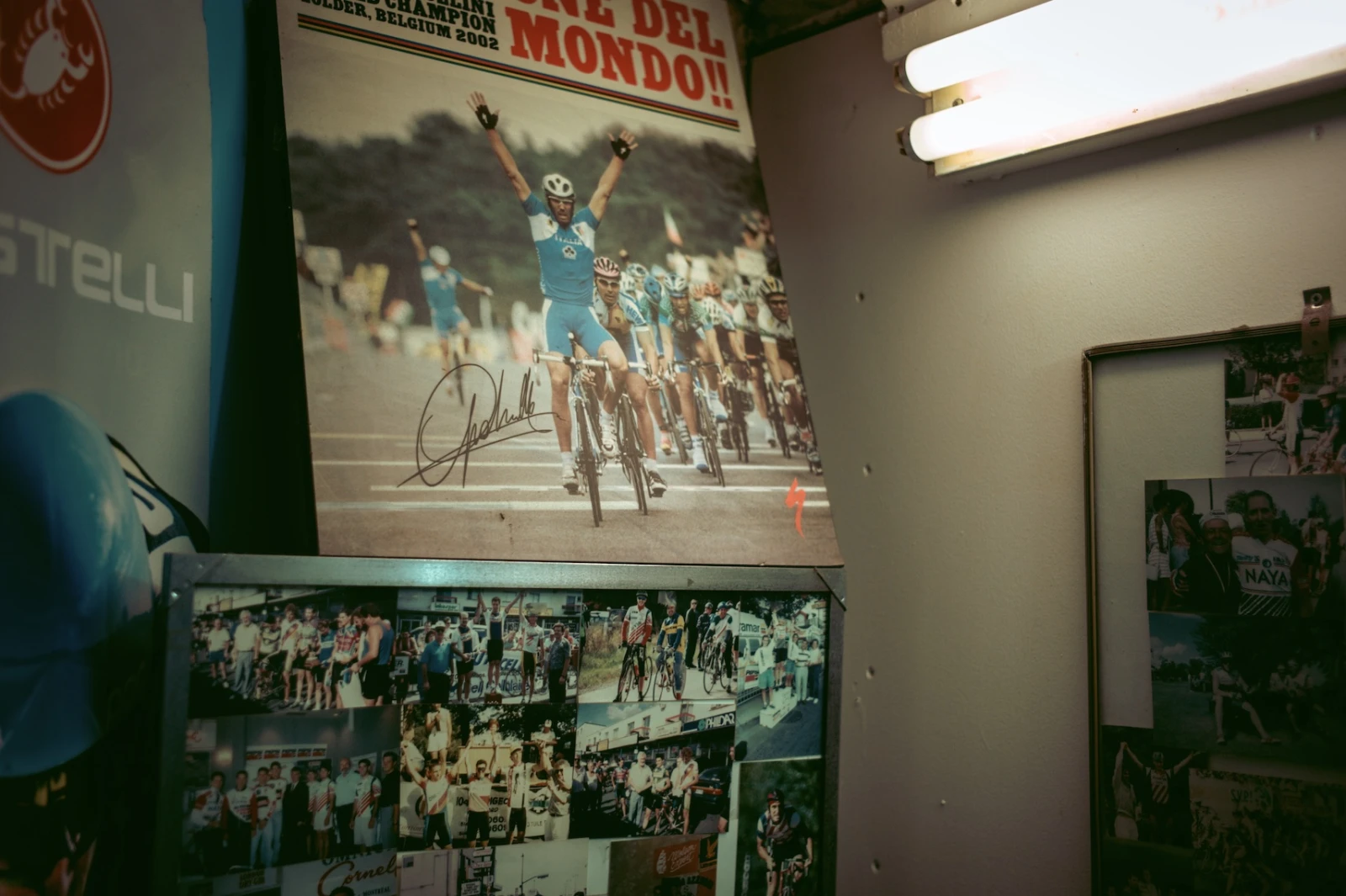 À 71 ans, avec ses cheveux grisonnants, son regard bleu perçant et son bagout inépuisable, Elio est une véritable mine d’histoires. Les murs de sa boutique sont ornés de maillots signés, d’affiches dédicacées, de trophées et de photos jaunies. Un petit musée peuplé de souvenirs d’une longue carrière. Ses souvenirs déambulent des jeunes poulains qu’il a entraînés aux légendes qu’il a rencontrées comme Gino Bartali, Mario Cipollini et son gilet zébré ou Chiappucci, en passant par son vieil ami Marinoni ou le journaliste Foglia, d’autres fous de vélo avec qui il partage une passion commune.