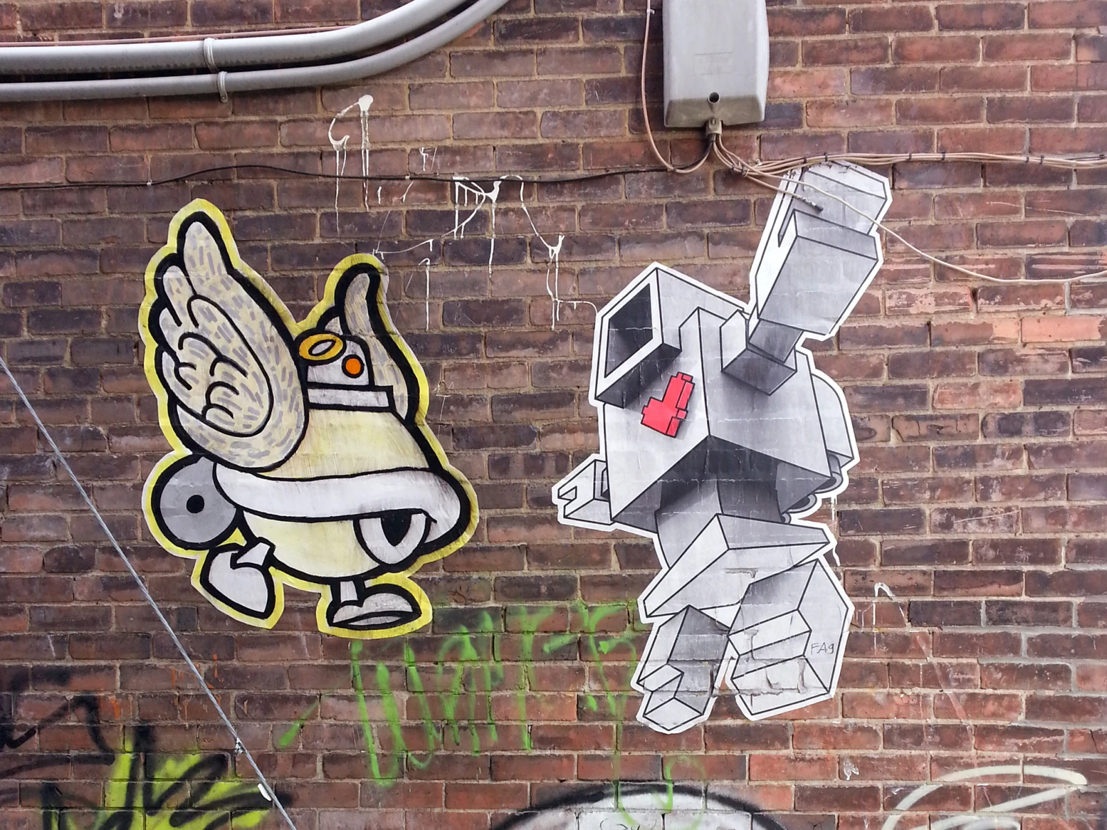 L’art de rue collé (wheat paste en anglais) permet de mettre plus de temps sur son oeuvre avant de l’afficher. C’est aussi beaucoup plus rapide de la coller que de la peindre sur place, opération souvent réalisée pendant la nuit. Ça coûte moins cher d’imprimer que de peindre et on peut en faire des tonnes de copies. Il y a cependant plusieurs désavantages: ça prend une surface pas trop poreuse, les couleurs changent lorsqu’elles sont trop longtemps au soleil et ça décolle facilement. Si la recette de colle est le moindrement faible, il sera facile pour quelqu’un de l’enlever avant que l’hiver ne s’en charge. En attendant les nouvelles œuvres qui apparaîtront pendant le printemps, en voici 8 que j’ai aperçu à Montréal au cours de la dernière année.
