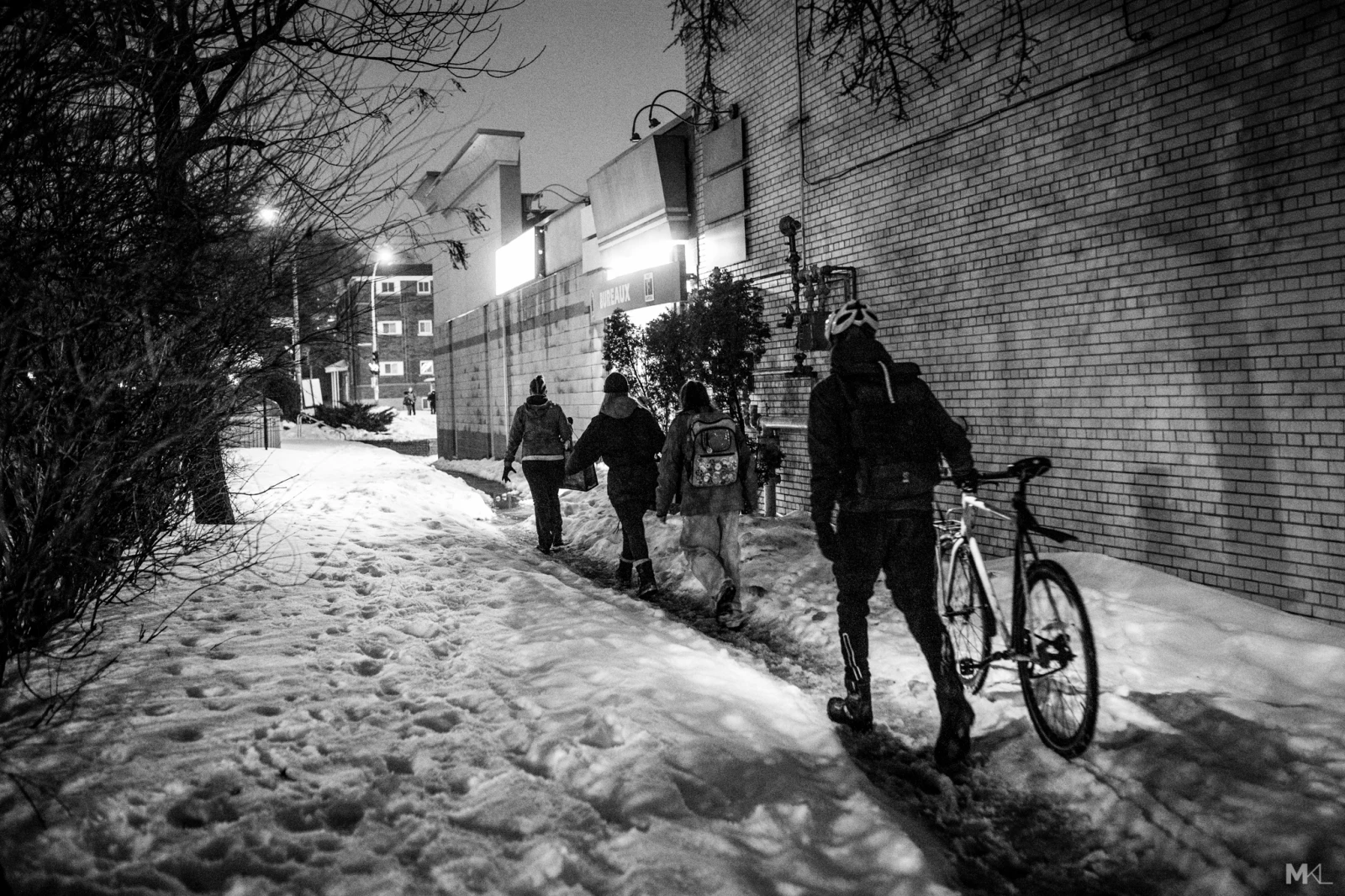 Je les retrouve chez Léa et Antoine, qui sont colocs et amoureux. Tous ne sont pas gearés de la même manière pour notre expédition : Antoine est protégé de la tête au pied, de ses grosses bottes d’hiver à la lampe frontale qu’il porte sur son casque de vélo. Valérie elle, ne porte qu’un jogging et a même laissé ses mitaines au placard.