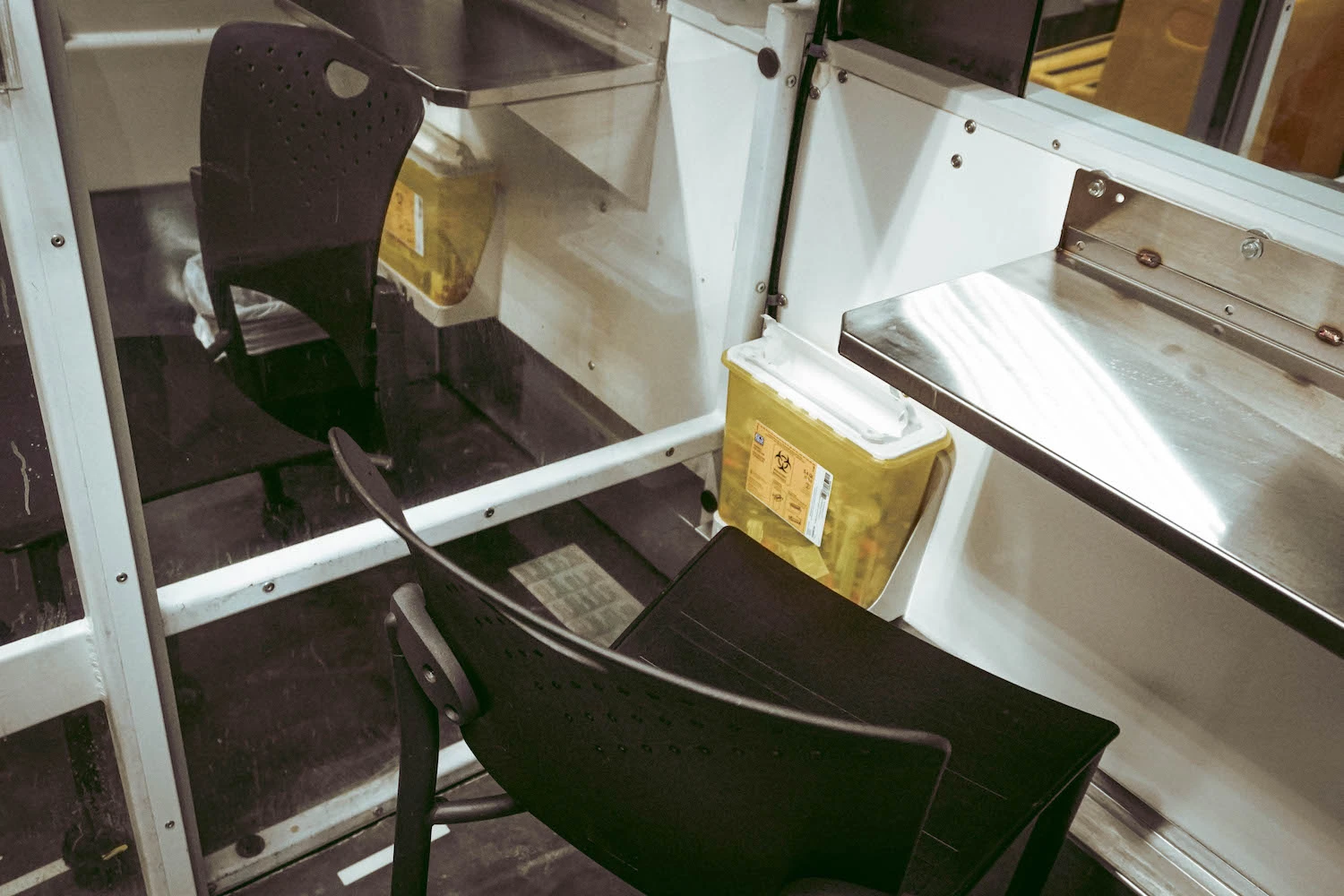 À chaque arrêt, les usagers peuvent utiliser l’espace d’inhalation supervisée, en opération depuis décembre. Très attendu, souligne Karina, il est équipé d’une porte transparente et d’un système avancé de ventilation et de filtration de l’air. Il peut accueillir deux personnes à la fois, avec la possibilité de consommer par injection. Un troisième siège, à l’extérieur du cubicule, est réservé aux injections.