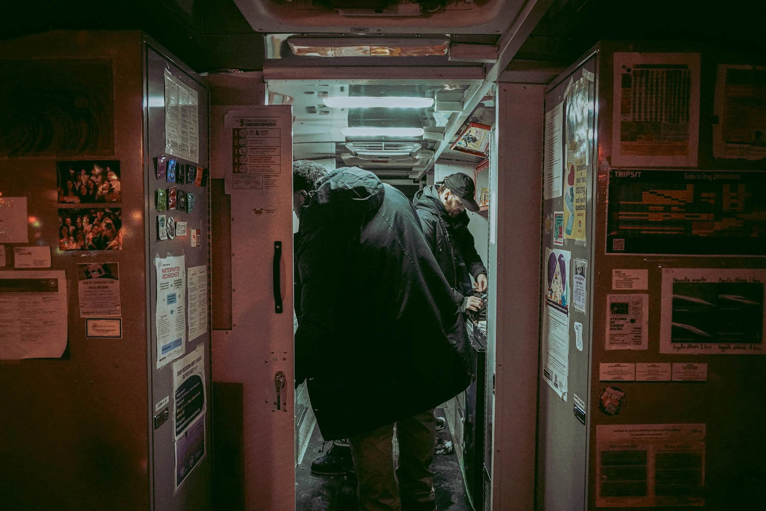 « Tu vas voir, les choses vont aller vite ce soir », me prévient Félix-Antoine Guérin, qui coordonne le programme d’intervention de proximité de L’Anonyme. Quelques minutes plus tard, je grimpe à bord du tout nouvel autobus de l’organisme, reconnaissable à son revêtement imitant un mur de briques graffé. Il abrite le seul espace d’inhalation supervisée actuellement en opération à Montréal.