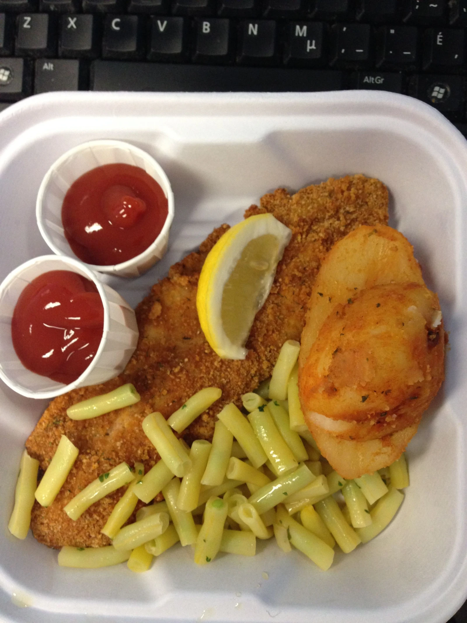 Un poisson pané sec. Une couple de fèves jaunes à l’eau en canne. Deux morceaux de pommes de terre trop cuites. Trois heures de mal de ventre. C’était le menu “santé”, l’affaire la plus équilibrée sur la carte du jour.