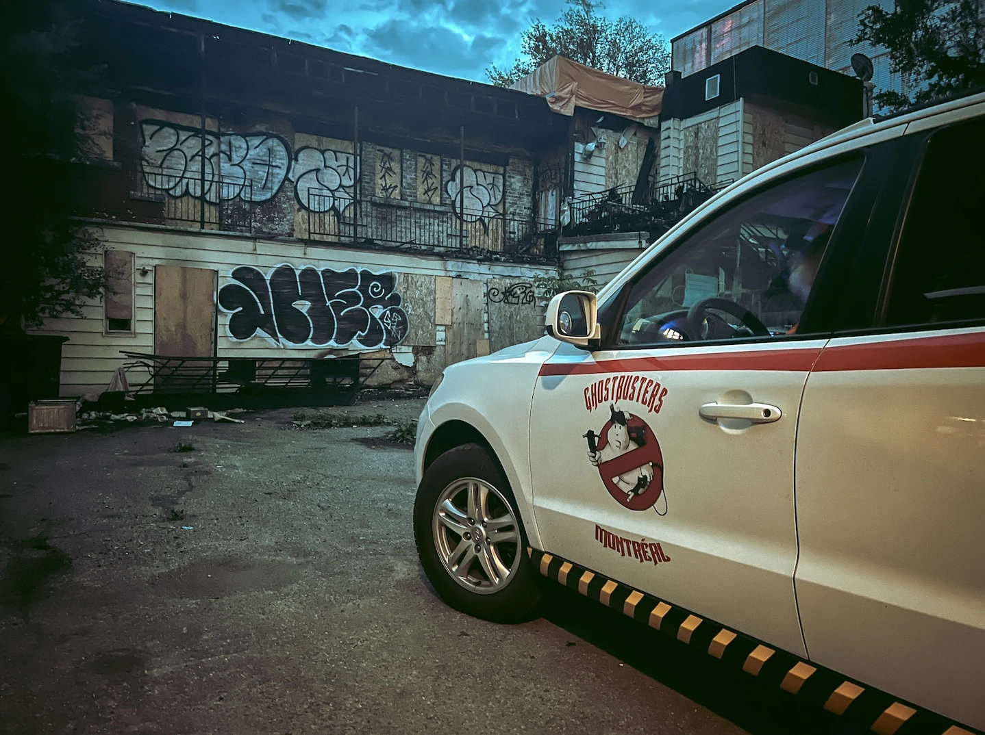 Notre Santa Fe blanche transformée en Ectomobile s’aventure dans la ruelle. Coincé entre des propriétés neuves soigneusement entretenues, l’édifice à l’arrière délabré contraste avec l’environnement propret.