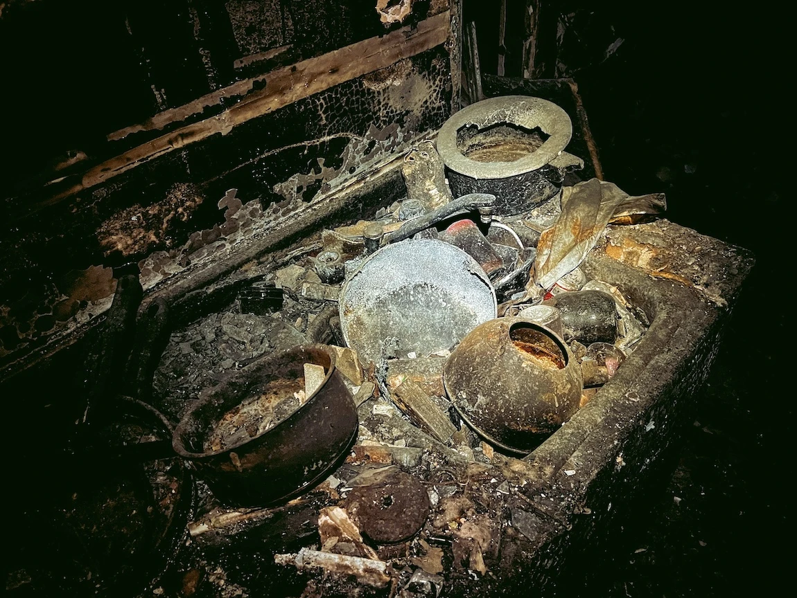 Sur le comptoir de la cuisine, j’aperçois des talons aiguilles et des bouteilles de bière, tandis que les éviers débordent de vaisselle. Les murs révèlent des tags et l’on trouve au sol des pipes en verre ainsi que des trousses de naloxone éventrées. C’est pas un luxe d’être piégée dans une crack house calcinée.