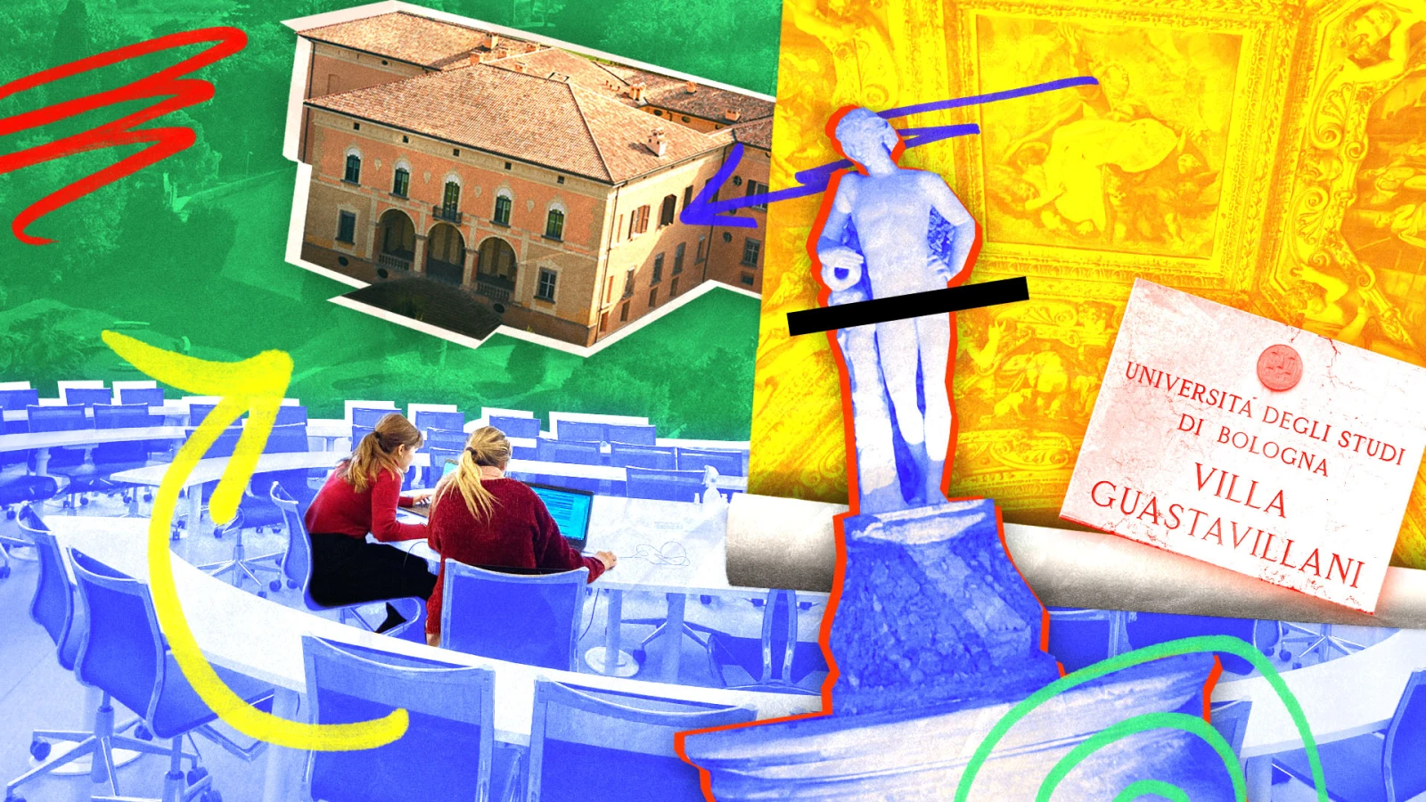 Le chemin à pic pour monter jusqu’à la villa est si exigu et sinueux que le chauffeur d’autobus doit régulièrement klaxonner pour prévenir lorsqu’il tourne. Brume et végétation se densifient le long du trajet de quinze minutes entre le centre-ville et l’imposante arche de pierre annonçant l’entrée de la Bologna Business School.