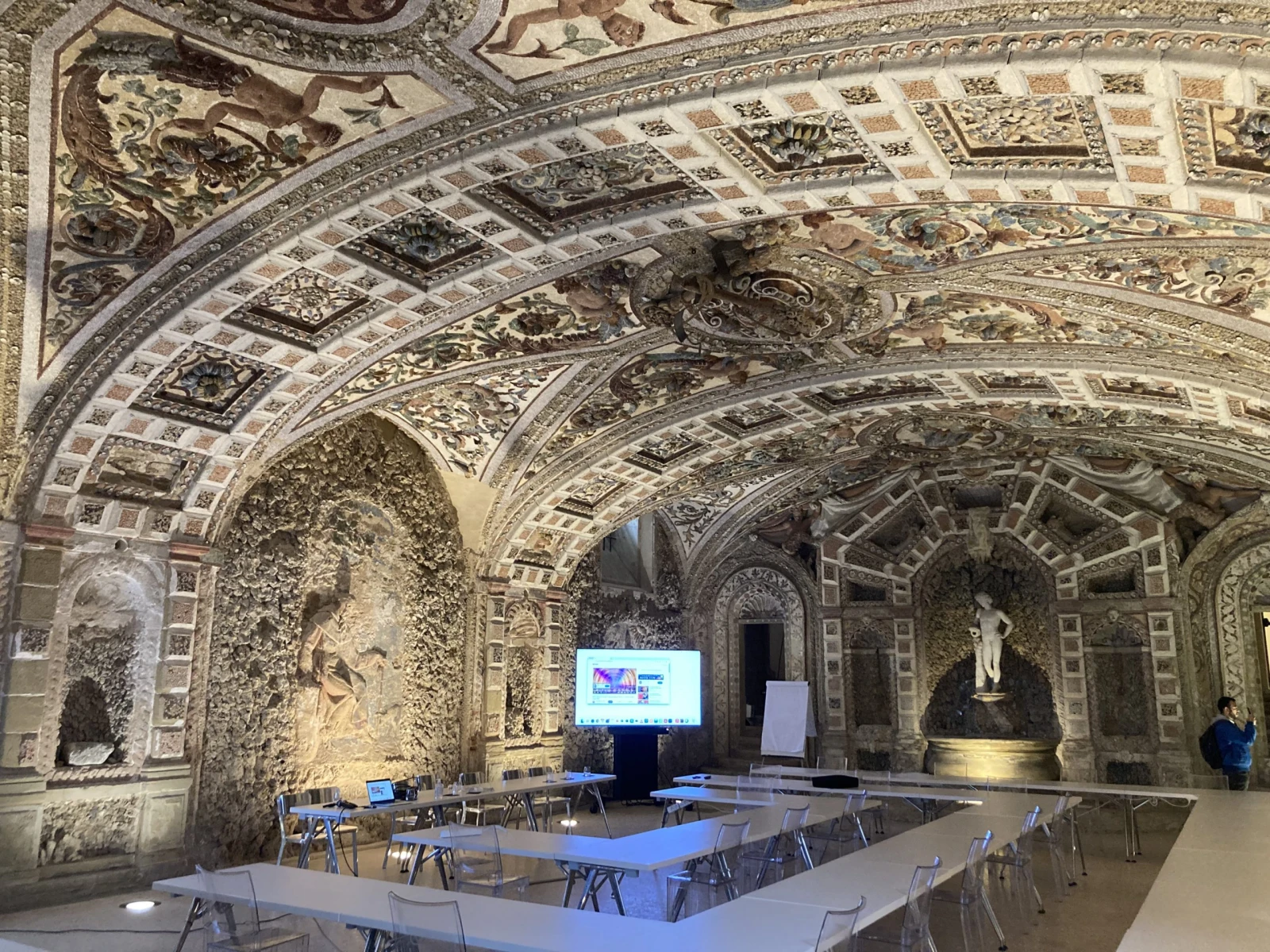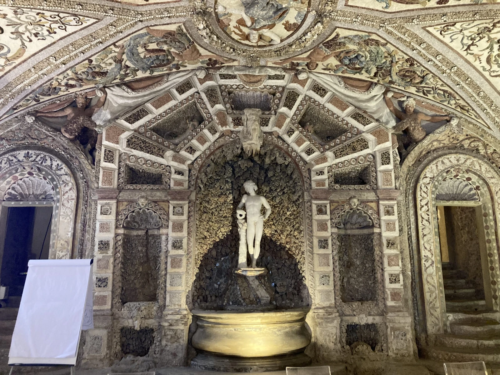 Ce jardin donne sur une porte de bois ouvrant sur la Grotta del Ninfeo, une véritable grotte faite sur mesure. Des stalactites, des roches et des coquillages sont collés du sol au plafond. La nature y rencontre l’art.