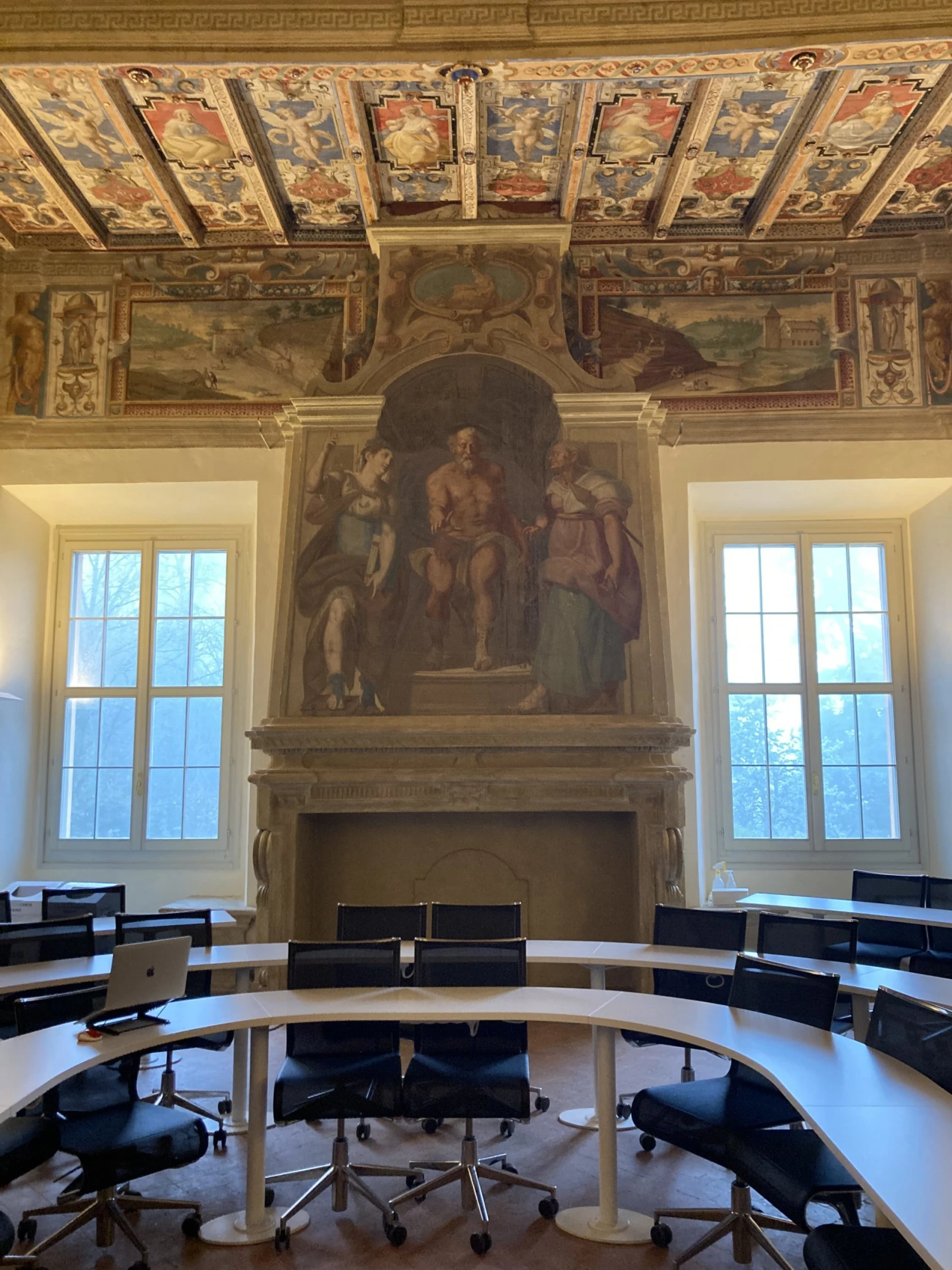 Tout juste à l’extérieur des murs de la ville de Bologne, dans le nord de l’Italie, cette merveille architecturale accueille dorénavant la Bologna Business School, donnant une allure muséale aux salles de cours. Des fresques ornent presque chaque mur.