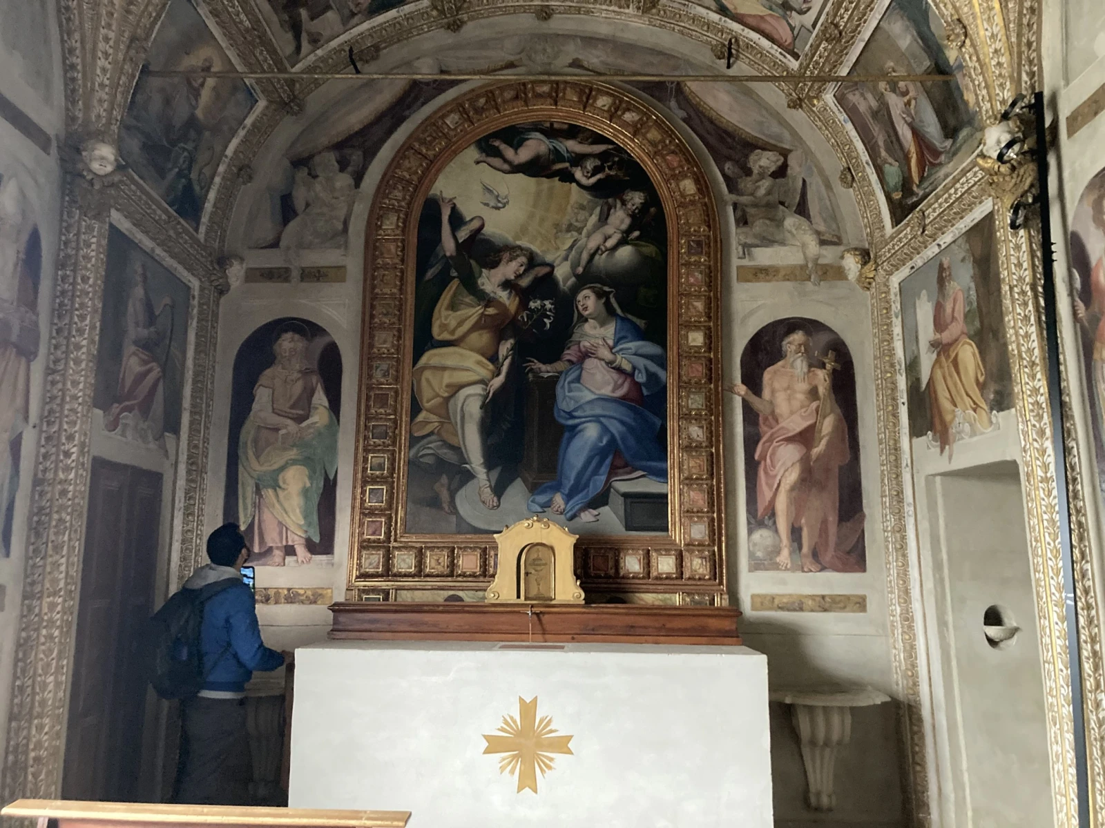 Une chapelle se cache aussi dans les dédales de la Villa Guastavillani. De l’extérieur, on croirait surtout entrevoir un cachot ou une cellule de prison en raison du grillage métallique. Il ne faut pas se fier aux apparences, cependant. En entrouvrant une porte de bois fragile et grinçante, un autel et quelques rangées de bancs de messe se révèlent, boudés ou oubliés par la communauté de la Bologna Business School.