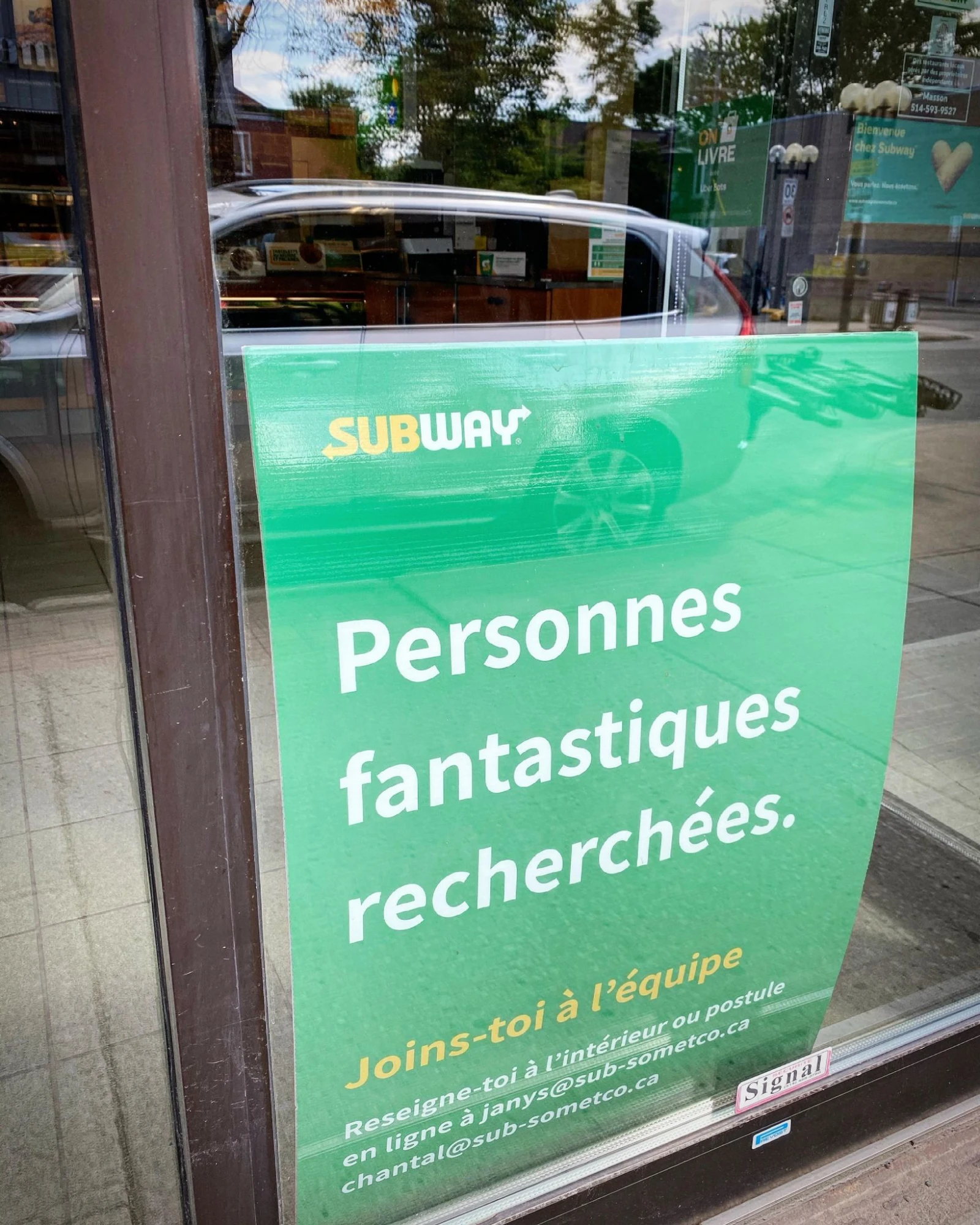 Inutile de marcher longtemps sur Masson pour s’enfarger dans les emplois disponibles. Un.e plongeur.se et un cuisiner.ère au Copain d’abord, une serveuse au Pizza 2 pour 1, plusieurs postes chez McDo, une serveuse d’expérience au Planète Oeuf, du staff en cuisine au Quai no.4, sans oublier des «personnes fantastiques» chez Subway. Rien de moins.