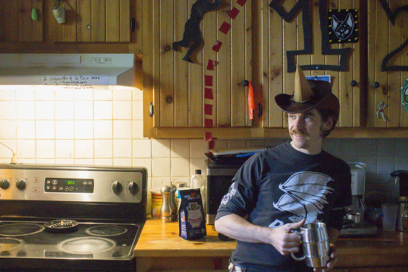 Le 1803 Saint-Christophe est un peu comme un marché aux puces. Coupures de journaux dans tous les coins, bibelots, collection de Pruneau de Passe-Partout suspendus, pénis en bois ou en plastique qui pendouillent du plafond de la cuisine : impossible de poser le regard sur quelque chose d’ordinaire.