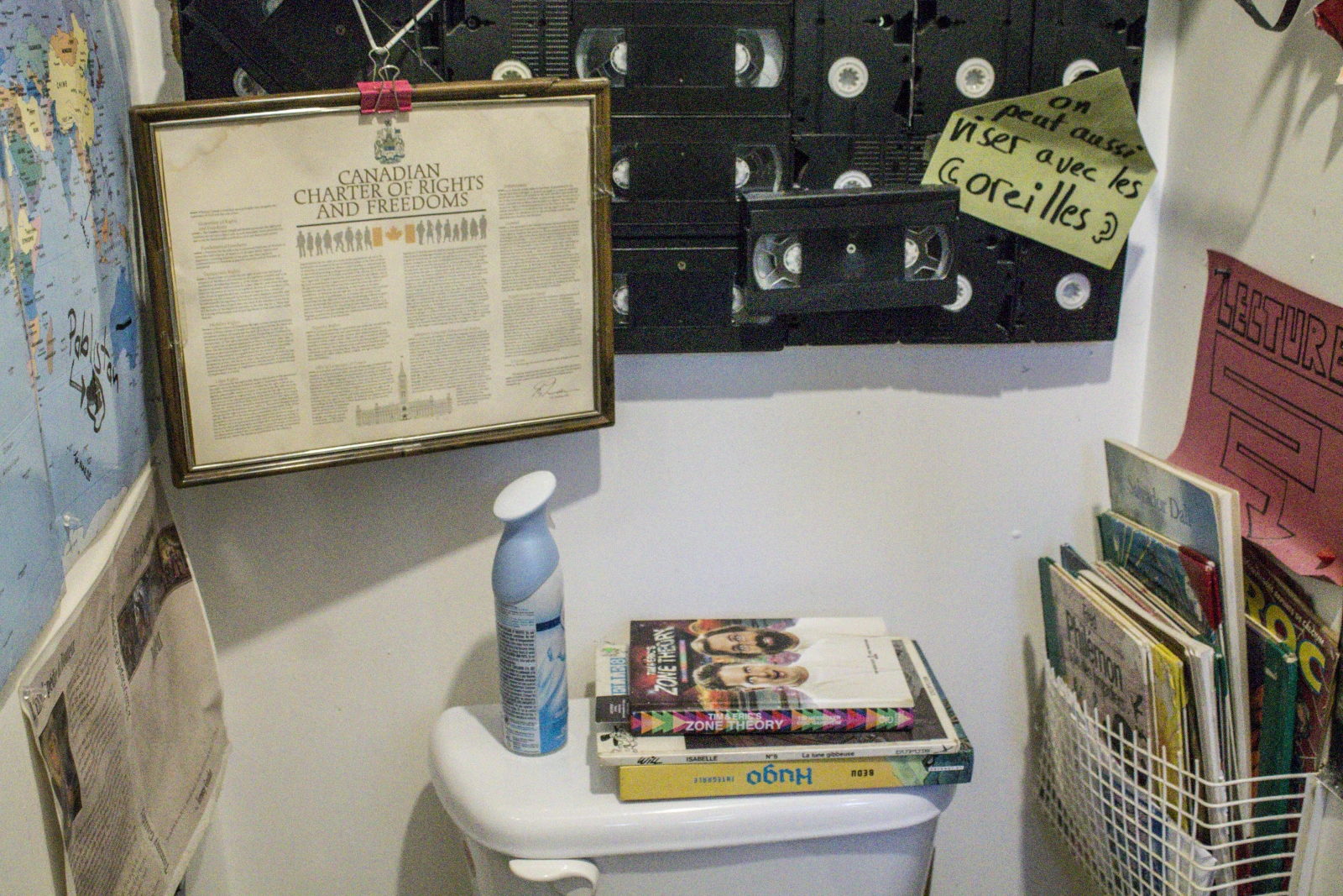 À l’intérieur de la pièce, sous la télévision et au-dessus de la cuvette, trône la Charte des droits et libertés. Mon guide et son accompagnateur ont suivi mon regard et en profitent pour faire dévier la conversation sur les failles du système de justice canadien. Je vous épargne les détails, mais la conclusion qu’en tire Sébastien CoRhino, c’est que « le système de justice au Canada, il sert à l’élite pis à ceux qui savent et comprennent comment ça marche. Il ne sert pas au Canadien ordinaire. »