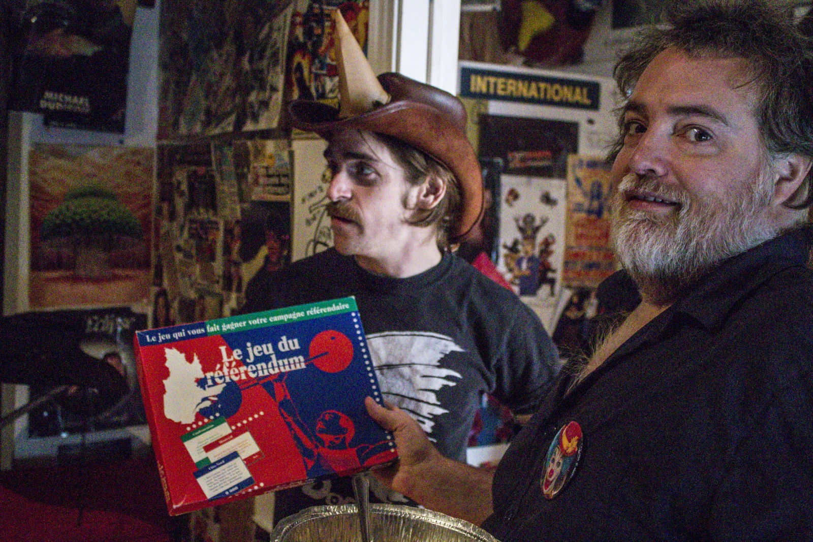 Dans un coin, le leader suprême fouille dans son sac. Il en sort un jeu de société intitulé « Le référendum de 1995 ». Je saute sur l’occasion pour lui demander quelle est la position du parti sur l’indépendance. J’apprends qu’il n’y a pas vraiment de ligne de parti chez les rhinocéros, mais que la position du chef, c’est que s’il devient premier ministre, toutes les provinces n’ayant pas signé la constitution seraient éjectées de la confédération.