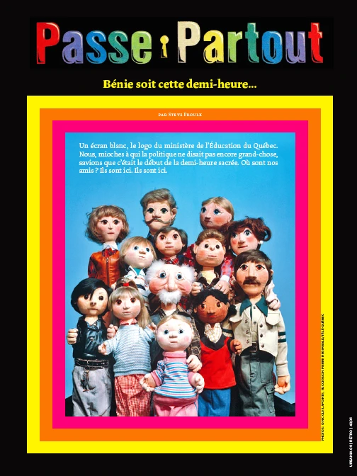 Une émission en particulier a marqué notre jeunesse et contribué à notre éducation : passe-partout. Pour ce numéro rétro, nous nous devions de rendre hommage à cette série culte. En plus de la photo exclusive de la couverture (quelle passion insoup çon née, n’est-ce pas ?), nous avons rencontré les principaux acteurs et créateurs, chacun y allant de ses anecdotes. Un bon dossier retraçant la genèse de l’aventure télévisuelle préférée d’une génération entière.