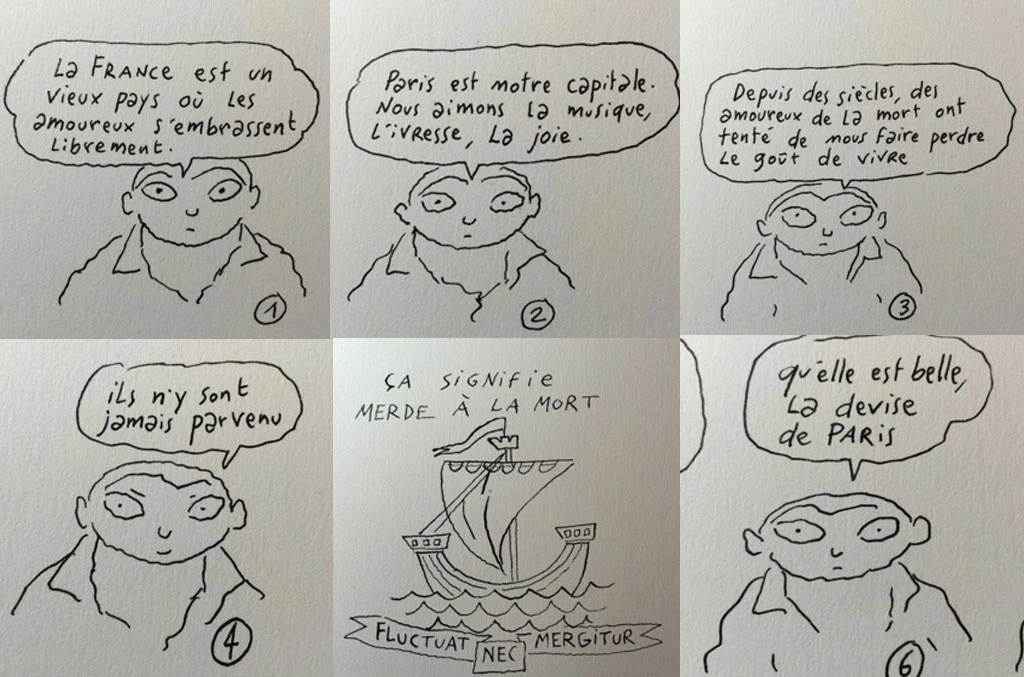 Description : Joann Sfar est un dessinateur, auteur de bande dessinée et réalisateur français. Suite aux attentats de Paris le 13 novembre dernier, il a publié une série de dessins émouvants.