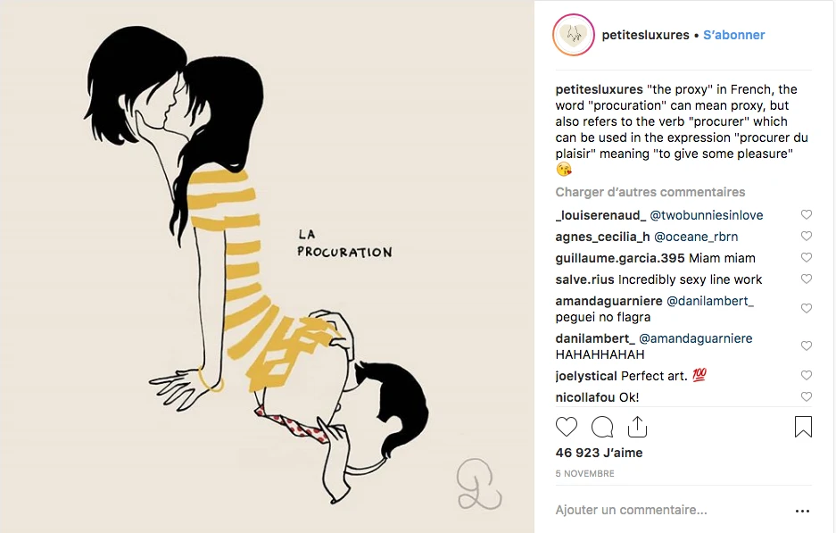 Le premier de notre liste est un genre de classique dans les comptes d’illustrations érotiques avec plus d’un million de followers sur Instagram. Les illustrations ici sont assez simples et c’est le plaisir d’imaginer ce qu’on n’y voit pas qui fait son petit effet. Seul bémol, les jeux de mots poches que l’illustrateur/trice s’amuse à ajouter aux posts. Ça ne tue pas complètement le mood, mais on pourrait s’en passer!