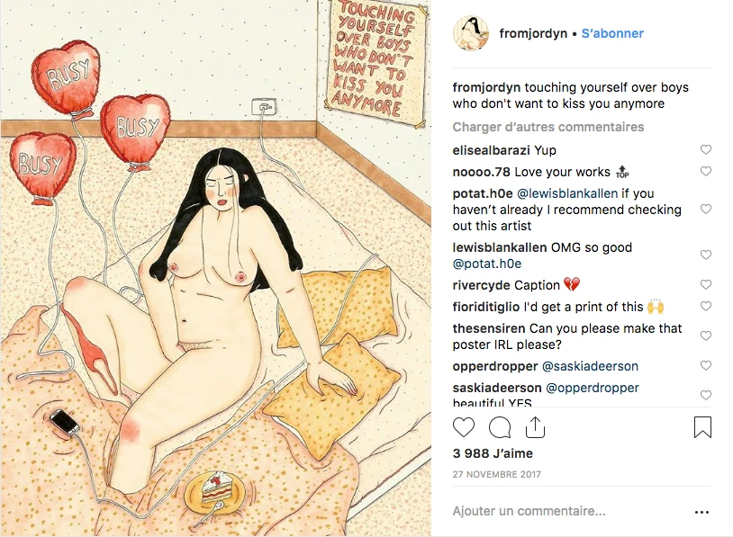 Un peu mélancoliques, les dessins de Jordyn McGeachin illustrent bien les hauts et les bas du dating. Des petits ajouts comme le tableau « Touching yourself over boys who don’t want to kiss you anymore » dans le post ci-haut, rentre direct dans les feels. C’est hot, mais ça rend aussi un peu triste. Du matériel parfait pour se masturber pis brailler un peu en même temps.