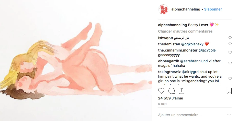 Alphachanneling décrit son compte comme une utopie érotique et on est un peu d’accord. Les illustrations sont variées (les corps aussi) et colorées, parfois même un peu psychédéliques. Que l’artiste joue avec la géométrie des individus ou s’amuse avec des formes plus floues et délicates, le rendu est toujours intéressant. Assez joli pour accrocher dans le salon, assez sexy pour déclencher un semi-croquant.