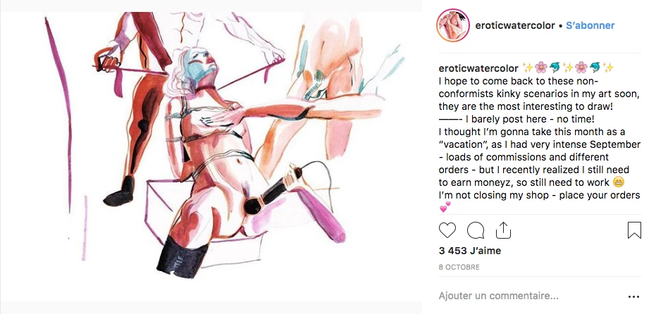 Le dernier compte, celui de Noomi Roomi présente des scènes érotiques peintes en watercolors. Le contraste entre des illustrations BDSM comme celle ci-haut et la douceur des couleurs et de la technique apporte vraiment un petit quelque chose de plus aux oeuvres. Noomi ne donne par contre pas que dans le BDSM, l’artiste aborde plusieurs autres aspects de la sexualité à travers son art.
