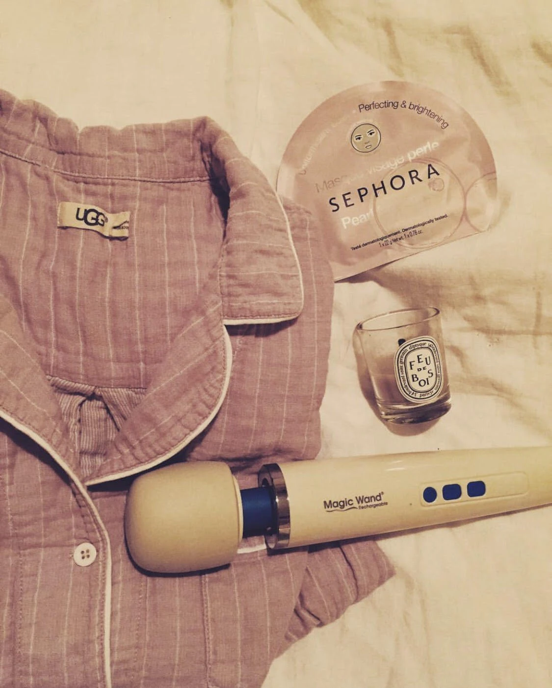 Vous essaierez ça en fin de semaine : un réveil douillet, un bon smoothie santé, une douche, un masque de beauté et pendant qu’il agit, une petite séance de Magic Wand. Vous êtes maintenant bien nourrie, toute propre, avec un teint éclatant et un sourire béat.