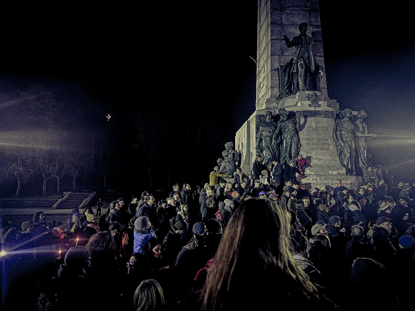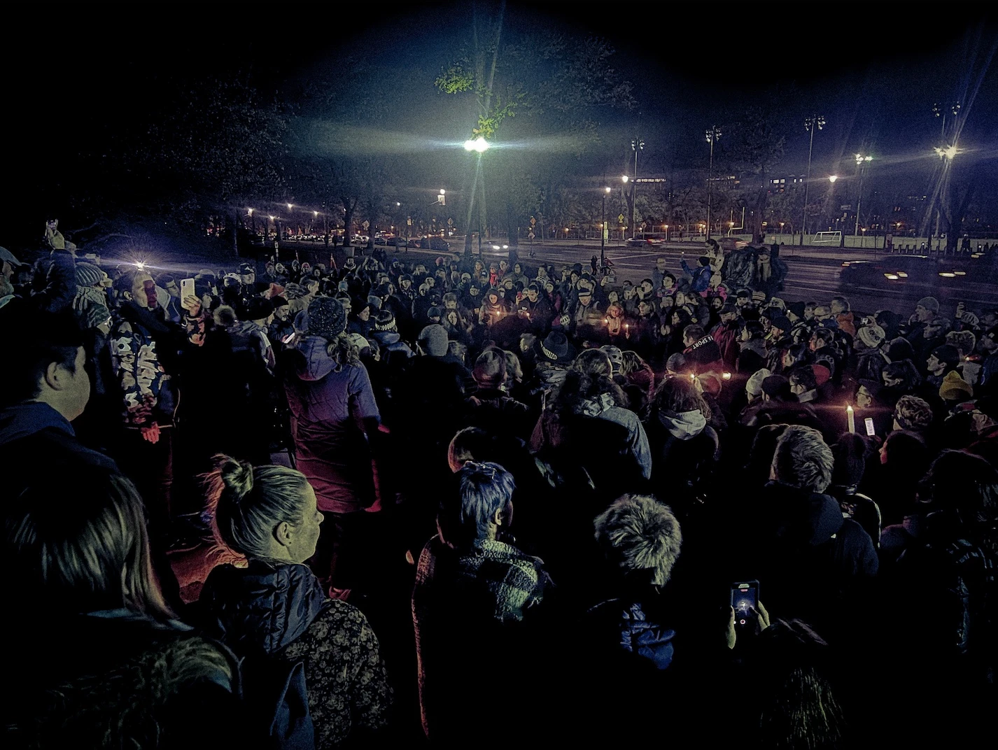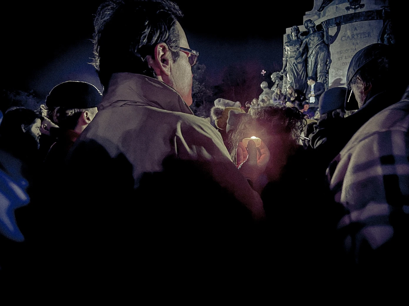 Dès 19h, à chaque signal vert sur l’avenue du Parc, des vagues de nouveaux arrivants rejoignent les participants munis parfois de bougies, parfois d’instruments de musique. Des jeunes, des plus âgés arborant des chapeaux de cowboys, des parents expliquant à leurs enfants ce qui vient de se passer. Bien que l’émotion imprègne la veillée, aucun signe de larme n’apparaît sur les visages.