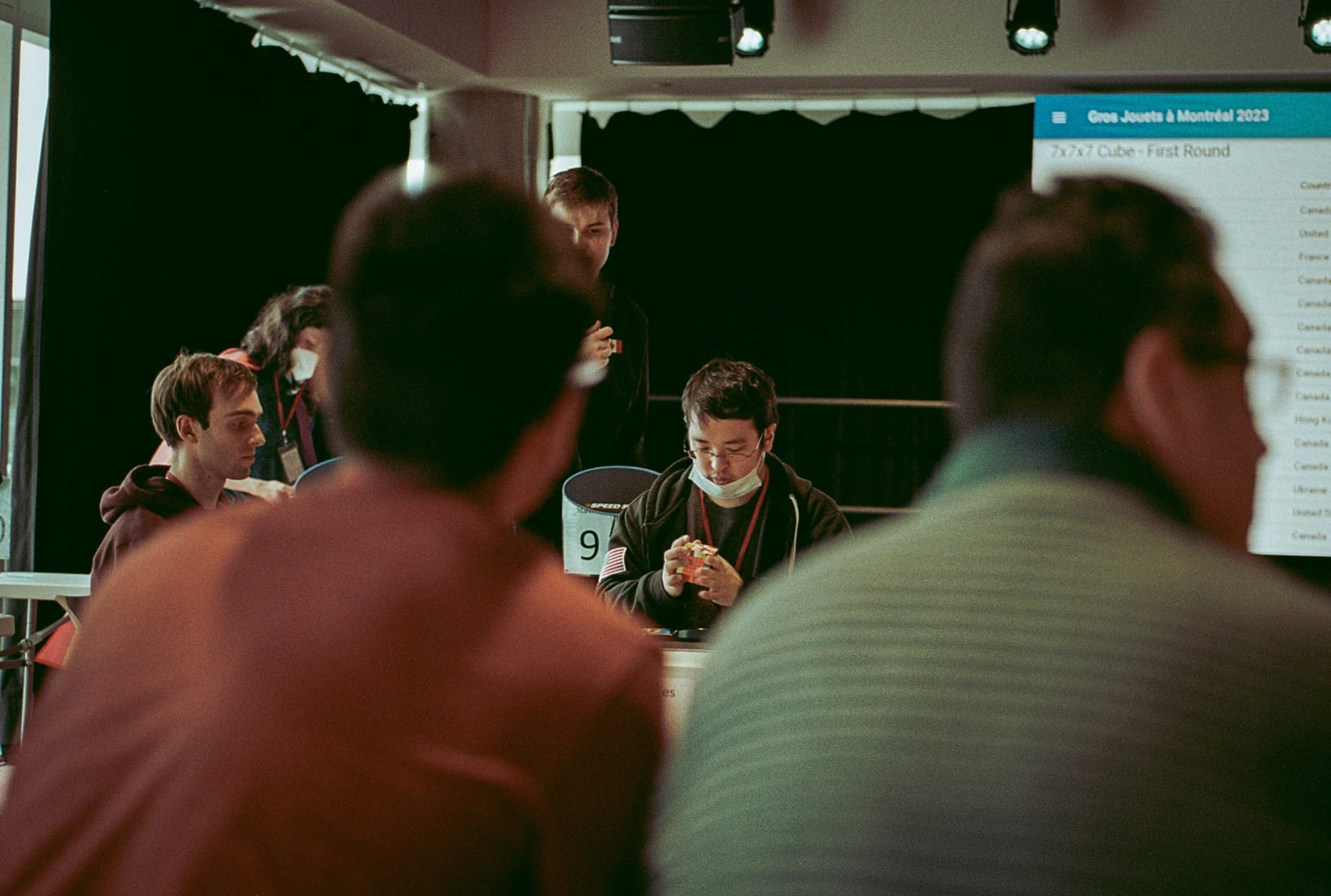 On me murmure en pointant Elliott Kobelansky qu’il est le grand favori dans les volets à l’aveugle. Il examine le scramble pendant quelques minutes puis signale au juge qu’il est prêt. Le bandeau s’abaisse, les lumières se ferment et la magie opère.