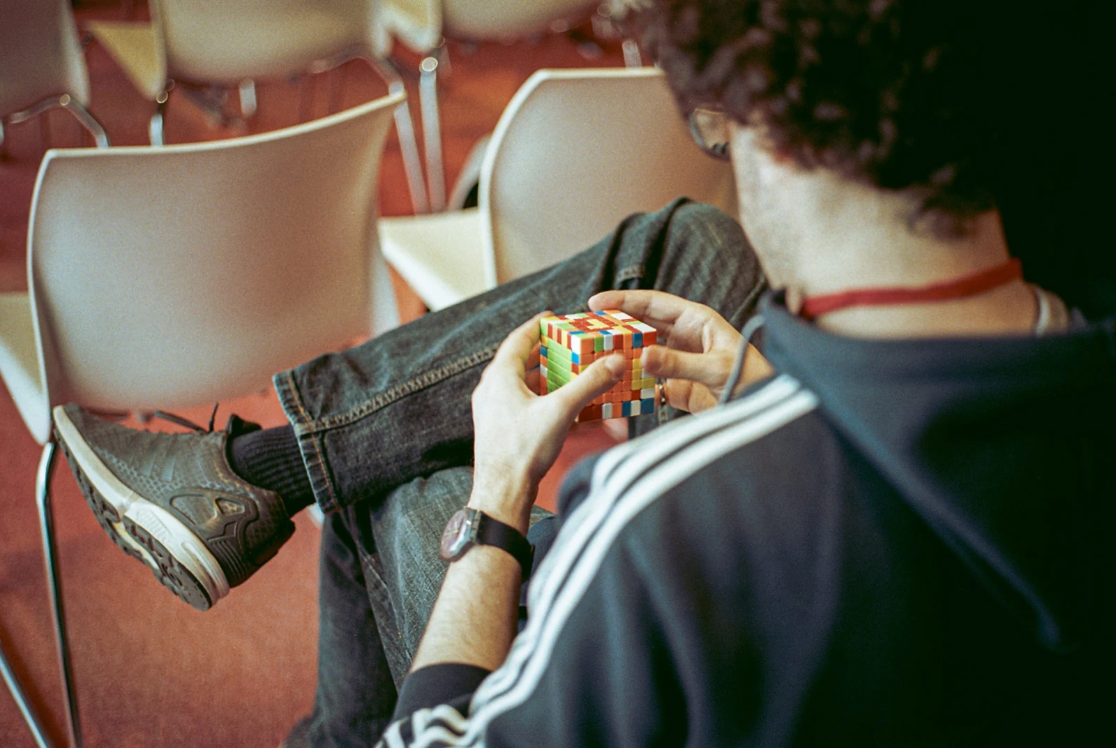 Un jeune revient essoufflé de son premier 7x7x7, l’épreuve la plus périlleuse, avec un temps costaud de plus de douze minutes. « Ça prend une éternité finir cette affaire-là », s’indigne-t-il, les bras mous comme un Ficello.