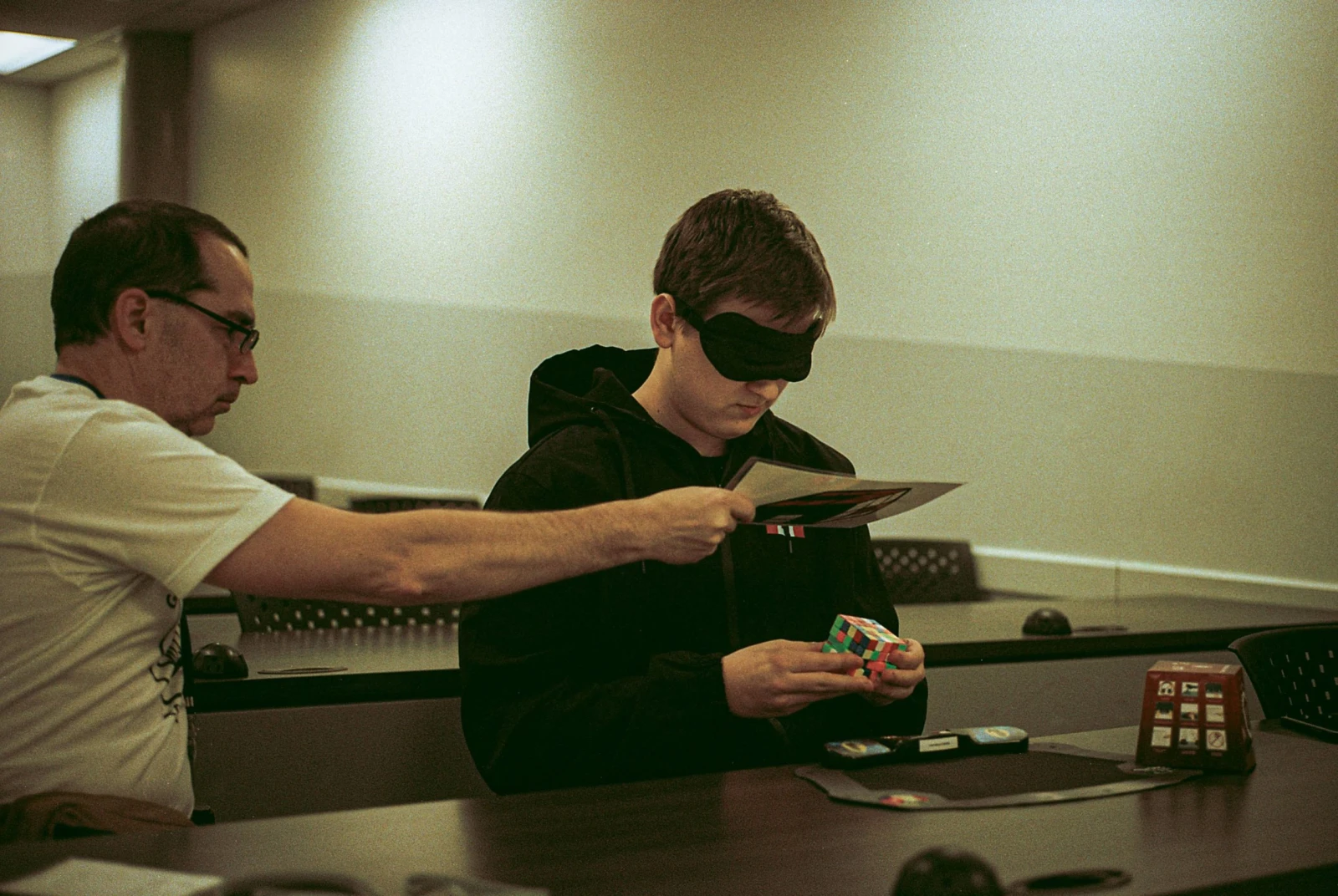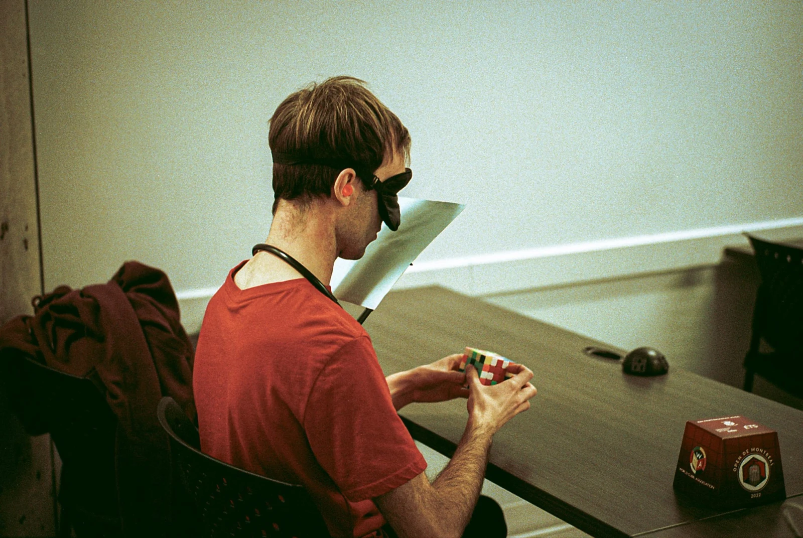 Dans une pièce réservée exclusivement aux compétitions à l’aveugle, quelques braves se frottent au défi de l’obscurité. Étrange scène où une petite foule s’agglutine autour de cubeurs aux yeux masqués munis de bavettes cartonnées empêchant toute triche.