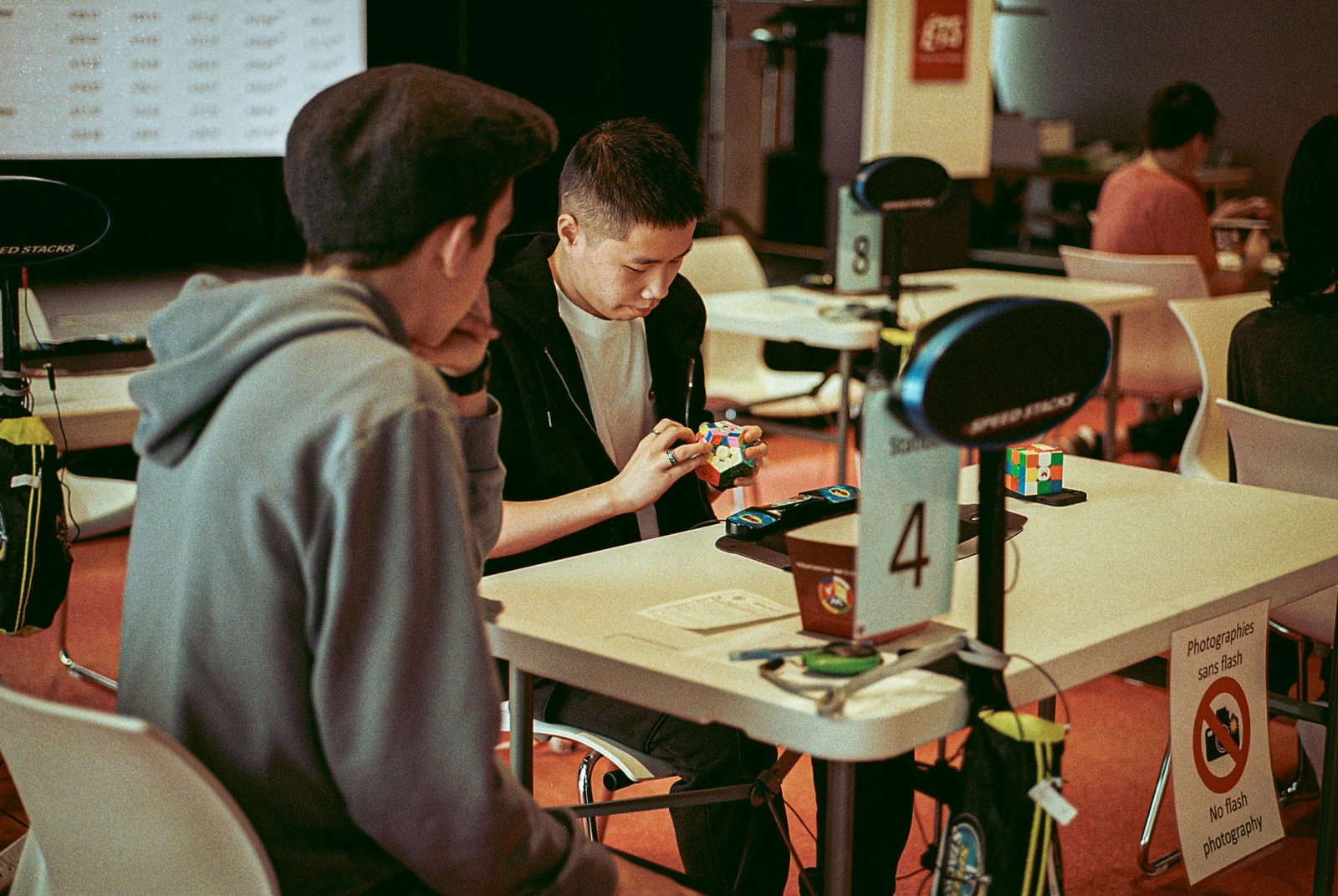 De nature calme, les cubeur.e.s de vitesse dévoilent peu d’émotions. Les rares éclats de joie sont des poings en l’air spontanés à la suite d’un cube chanceux accompagné par quelques regards ébahis. Si certain.e.s sont satisfait.e.s de leurs performances, d’autres semblent anéanti.e.s.